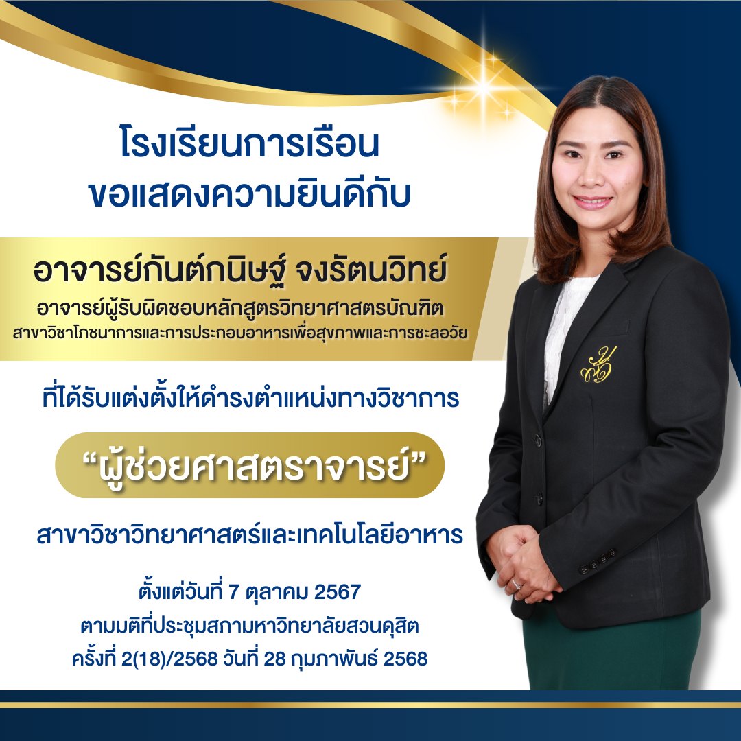 ขอแสดงความยินดีกับนักศึกษาชั้นปีที่ 2นางสาวธฤษวรรณ กังสดาลพิภพนางสาวรมิดา ธรรวงค์สาขาเทคโนโลยีการประกอบอาหารและการบริการโรงเรียนการเรือน มหาวิทยาลัยสวนดุสิต ที่ได้รับรางวัล “ประกาศนียบัตร”จากการแข่งขันเมนู Appetizer, Main Course และ Dessertภายใต้หัวข้อ “Local to Global”ในงาน Gourmet & Cuisine Young Chef 2025เมื่อวันที่…