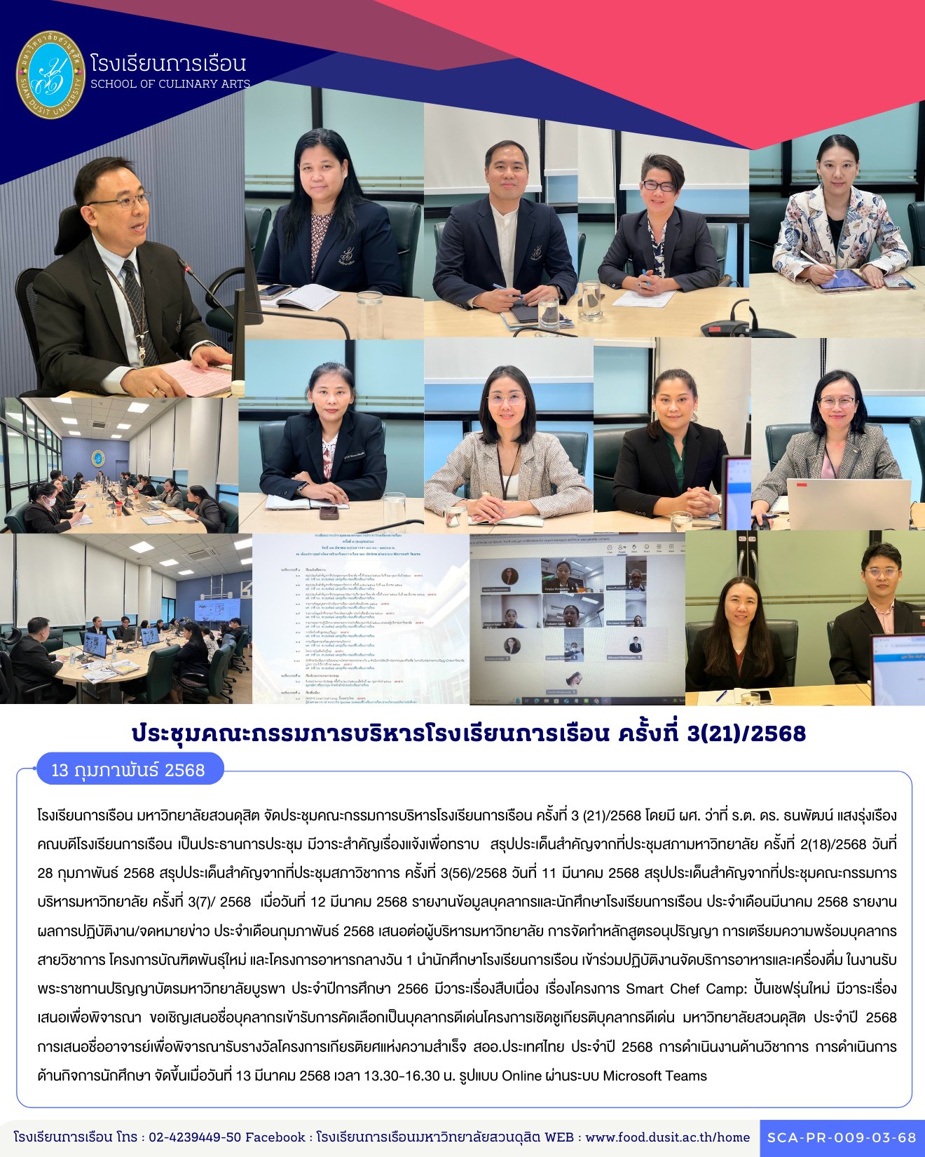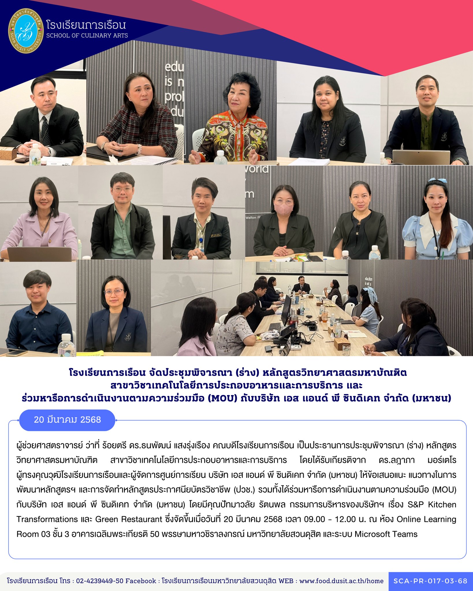 ผู้ช่วยศาสตราจารย์ ว่าที่ ร้อยตรี ดร.ธนพัฒน์ แสงรุ่งเรือง คณบดีโรงเรียนการเรือน เป็นประธานการประชุมอาจารย์ผู้รับผิดชอบหลักสูตรศิลปศาสตรบัณฑิต สาขาวิชาการจัดการธุรกิจบริการอาหารและศิลปะการประกอบอาหาร โรงเรียนการเรือน มีวาระแจ้งเพื่อทราบในเรื่องสำคัญ คือ การเตรียมความพร้อมในการรับสมัครนักศึกษาใหม่ผ่านระบบ TCAS’69 และการจัดการเรียนการสอนให้เป็นไปด้วยความเรียบร้อย จัดขึ้นเมื่อวันที่ 17 พฤศจิกายน 2568 เวลา 12.00-12.30…