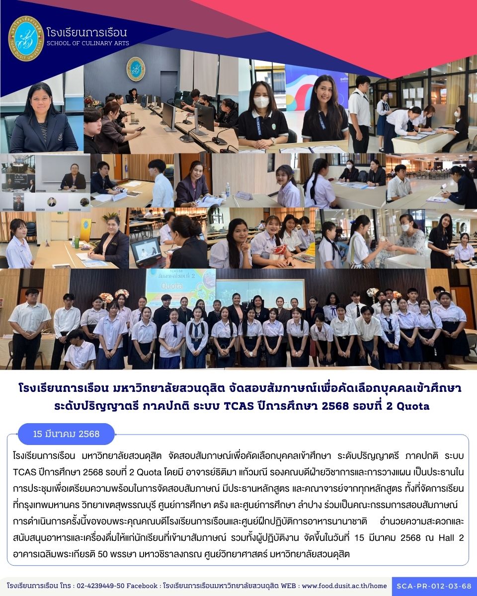 โรงเรียนการเรือน มหาวิทยาลัยสวนดุสิต จัดสอบสัมภาษณ์เพื่อคัดเลือกบุคคลเข้าศึกษา ระดับปริญญาตรี ภาคปกติ ระบบ TCAS ปีการศึกษา 2569 รอบที่