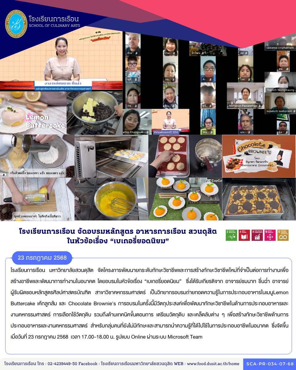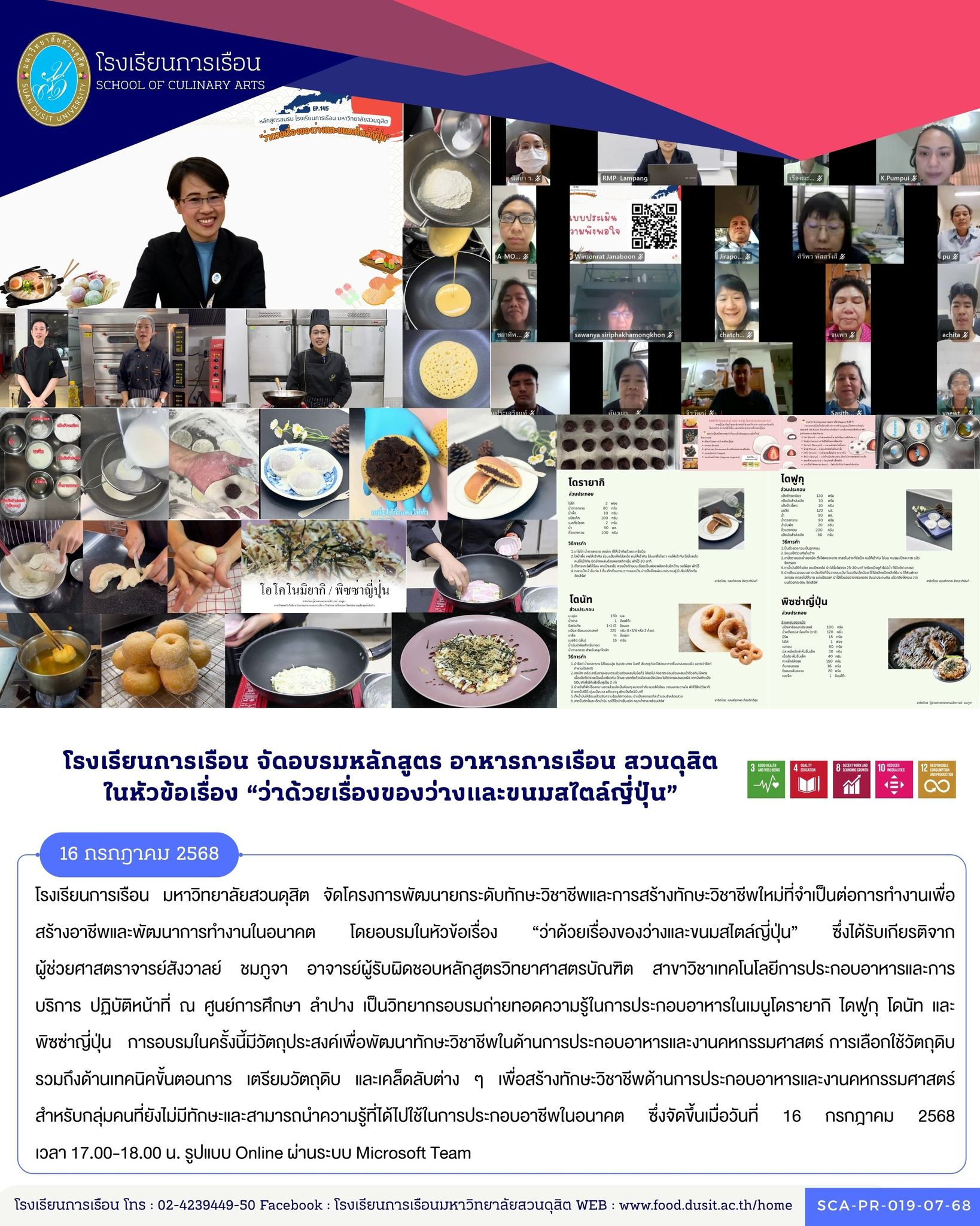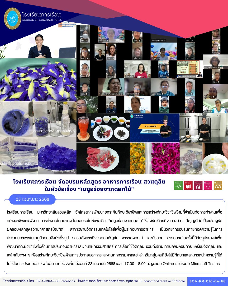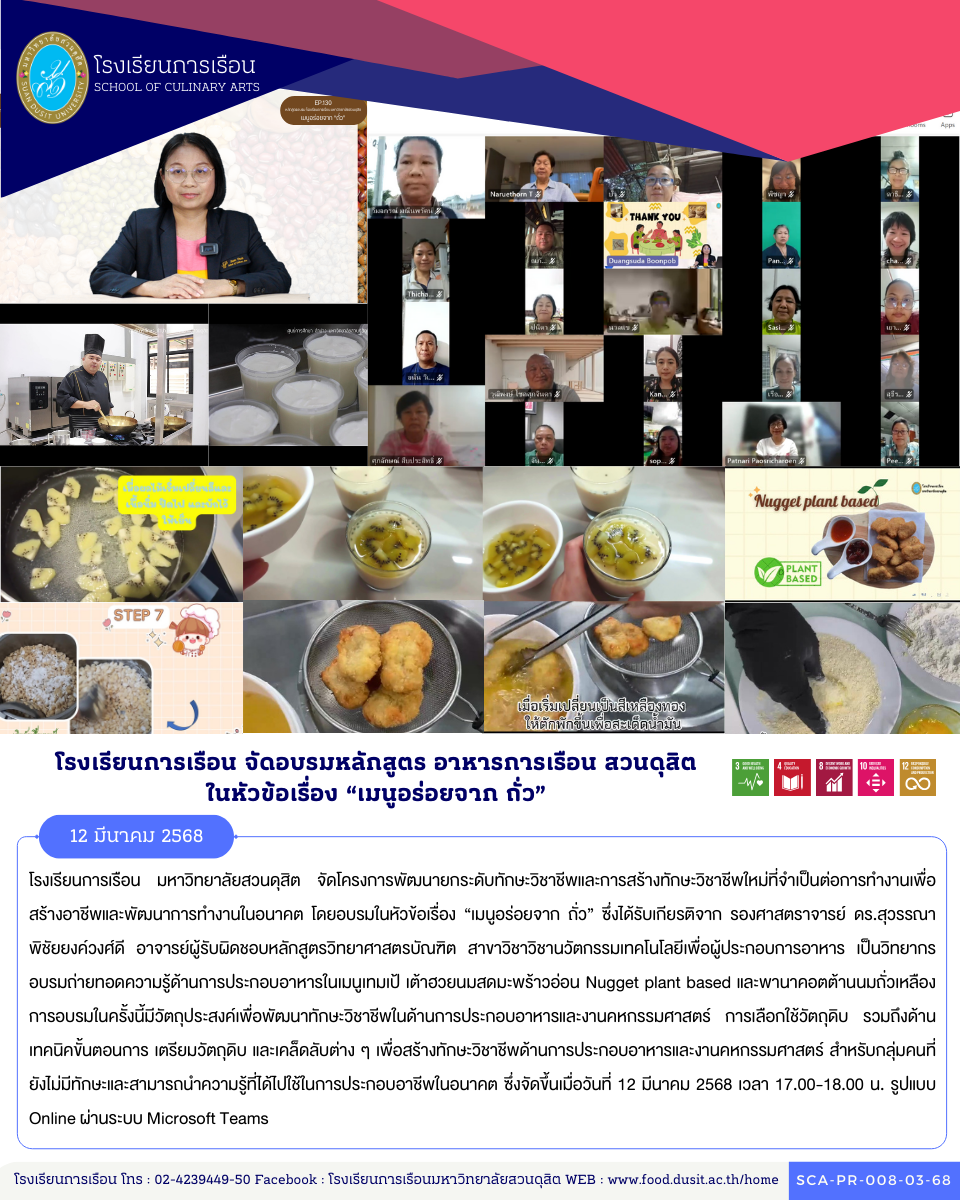โรงเรียนการเรือน มหาวิทยาลัยสวนดุสิต จัดโครงการส่งเสริมการเรียนรู้ตลอดชีวิตด้านอาหารและคหกรรมศาสตร์ ประจำปีงบประมาณ พ.ศ. 2569 โดยอบรมออนไลน์ในหัวข้อ Healthy Western Food ซึ่งได้รับเกียรติจาก ดร.ณัชฌา พันธุ์วงศ์ อาจารย์ผู้รับผิดชอบหลักสูตรศิลปศาสตรบัณฑิต สาขาวิชาคหกรรมศาสตร์ มหาวิทยาลัยสวนดุสิต วิทยาเขตสุพรรณบุรี เป็นวิทยากรอบรมถ่ายทอดความรู้การประกอบอาหารในเมนูสลัดหอยนางรม (อาหารต้านซึมเศร้า) สเต็กปลากะพงกับสลัดผัก…