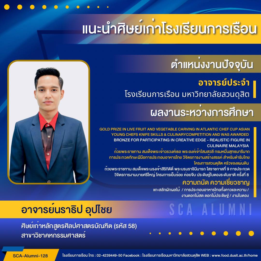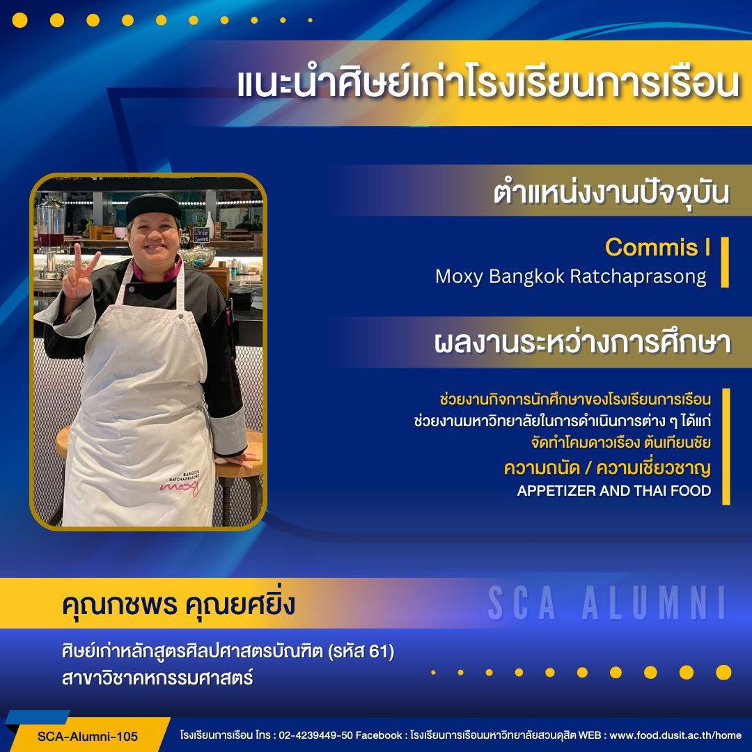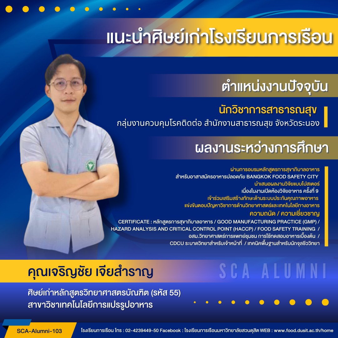 แนะนำศิษย์เก่าของโรงเรียนการเรือน รหัส 59 คุณสาริศา อารีย์ศิษย์เก่าหลักสูตรวิทยาศาสตรบัณฑิตสาขาวิชาเทคโนโลยีการประกอบอาหารและการบริการ ปัจจุบันทำงานอยู่ที่ : บริษัท กำลังอิน โปรดักชั่น จำกัดในตำแหน่ง : ผู้จัดการส่วนตัวเชฟอิน เพจกำลังอิน ผลงานระหว่างการศึกษา :- เข้าร่วมการแข่งขัน Makro HoReCa- ช่วยจัดกิจกรรมของสาขาวิชาและโรงเรียนการเรือน ความถนัด / ความเชี่ยวชาญ :…