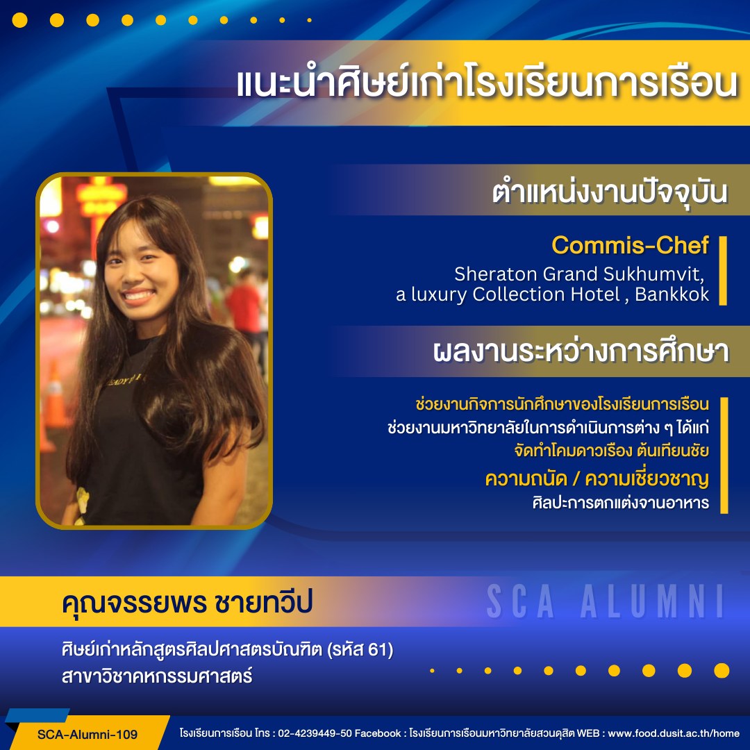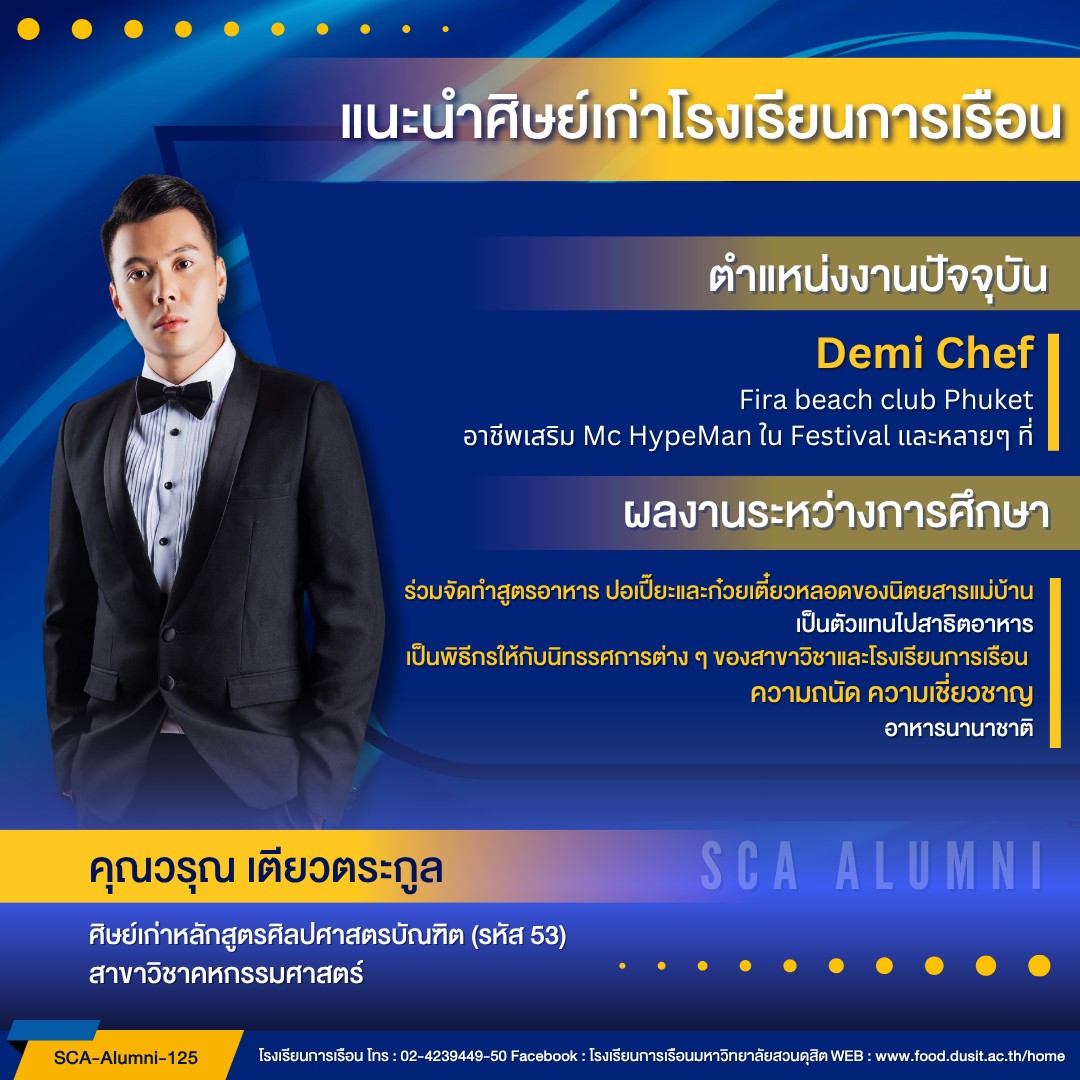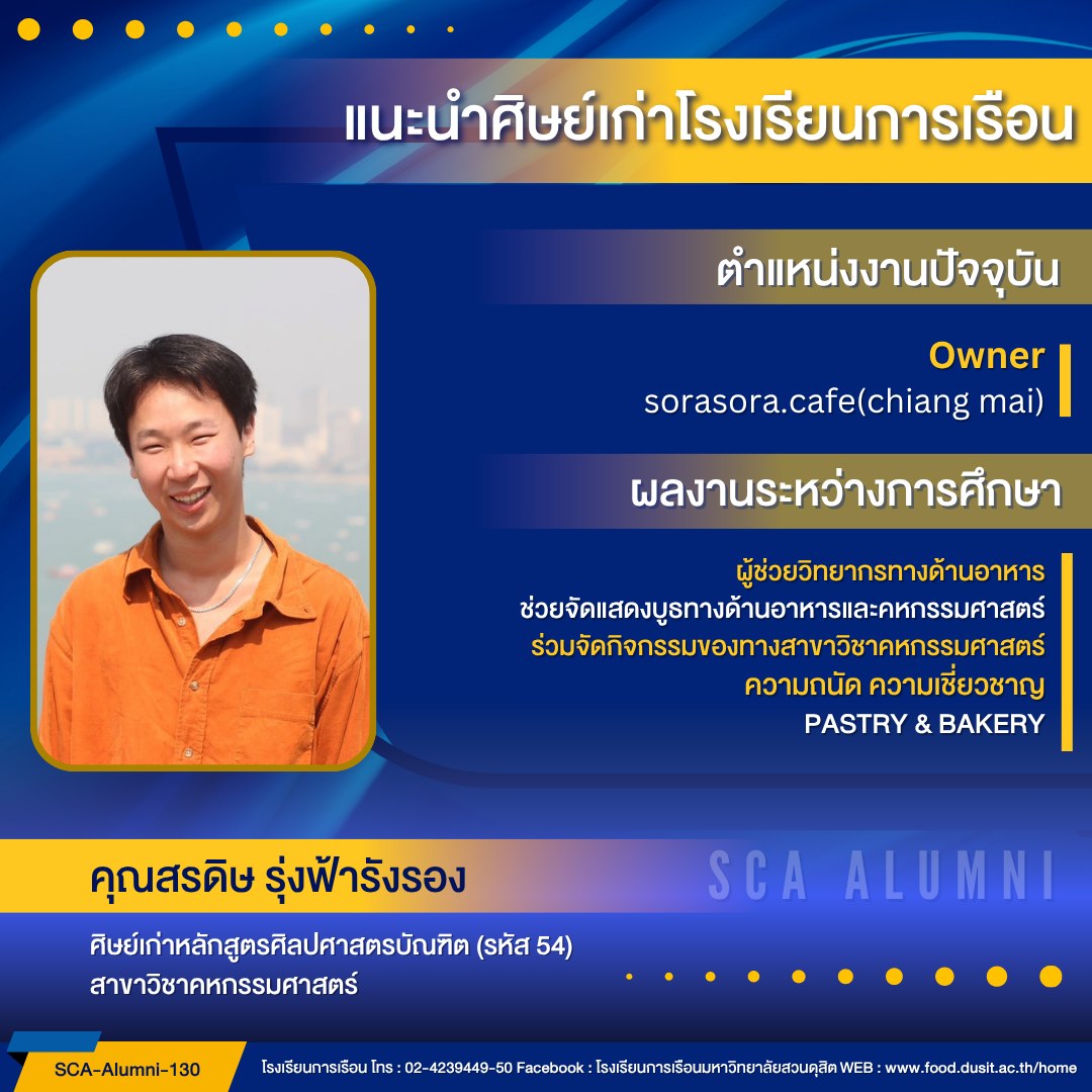 แนะนำศิษย์เก่าของโรงเรียนการเรือน รหัส 62 คุณวรณัณ ขำเนตรศิษย์เก่าหลักสูตรศิลปศาสตรบัณฑิตสาขาวิชาคหกรรมศาสตร์ ปัจจุบันทำงาน : ร้าน How’s Udonthaniในตำแหน่ง : Hot Kitchen Chef ผลงานระหว่างการศึกษา :- เข้าร่วมประกวดพิธีกร รายการ SDU Freshmen day 2019- เป็นพิธีกรในกิจกรรมต่าง…