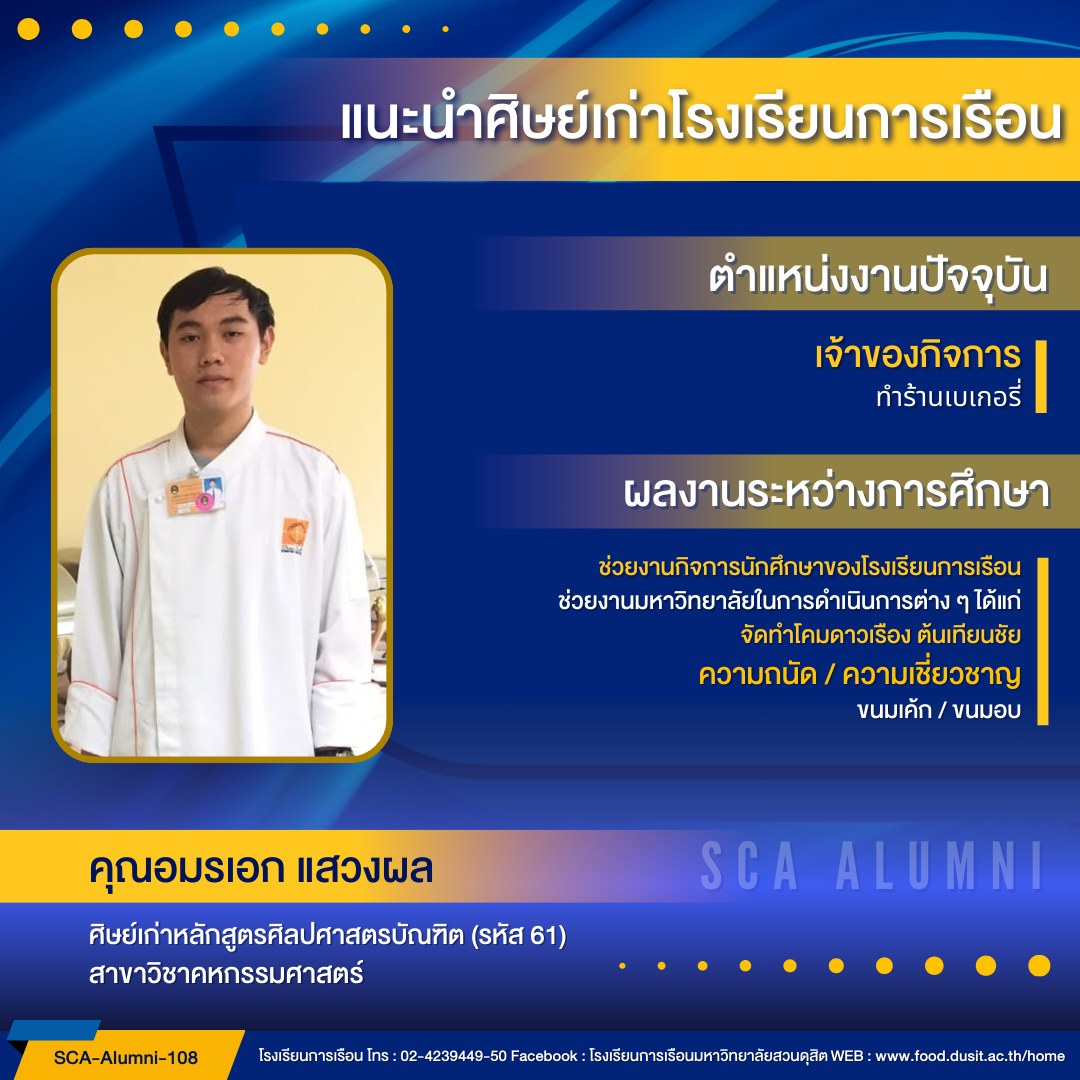 แนะนำศิษย์เก่าของโรงเรียนการเรือน รหัส 59 คุณณรงค์ฤทธิ์ แซ่ขอศิษย์เก่าหลักสูตรวิทยาศาสตรบัณฑิตสาขาวิชาเทคโนโลยีการประกอบอาหารและการบริการ ปัจจุบันทำงานอยู่ที่ : บริษัท กำลังอิน จำกัด(ครัวบ้านอิน)/ บริษัท กำลังอิน โปรดักชั่น จำกัดในตำแหน่ง : CEO / KOL ผลงานระหว่างการศึกษา :- Three Siver Medal…