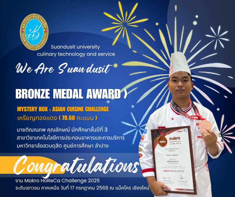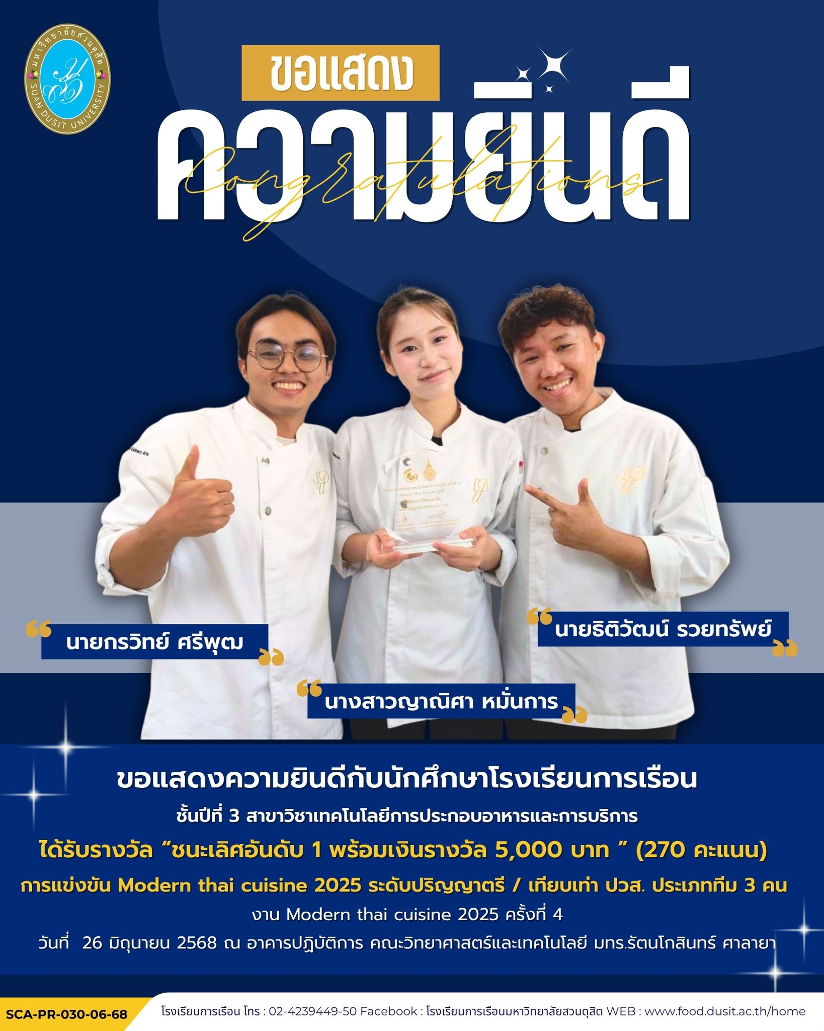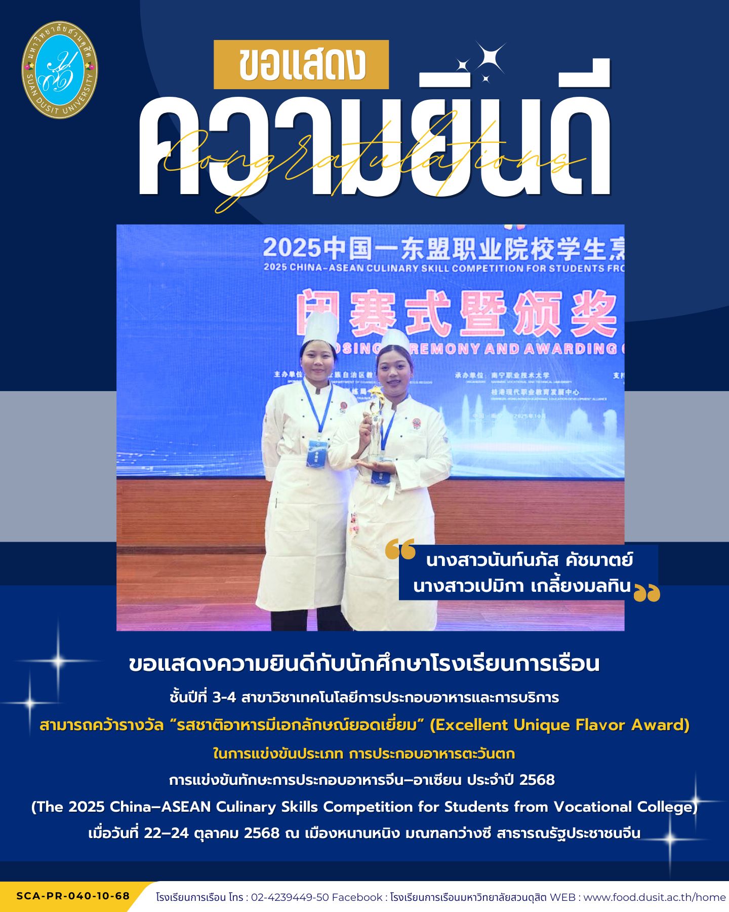 ขอแสดงความยินดีกับนักศึกษาชั้นปีที่ 4นางสาวพุทธน้ำบุตษ์ ตันนางสาวเปมิกา เกลี้ยงมลทินสาขาเทคโนโลยีการประกอบอาหารและการบริการโรงเรียนการเรือน มหาวิทยาลัยสวนดุสิตที่สร้างชื่อเสียงและความภาคภูมิใจคว้ารางวัล ชนะเลิศ โล่เกียรติยศ พร้อมเงินรางวัล 40,000 บาทจากการแข่งขัน Gourmet & Cuisine Young Chef 2025ความทุ่มเทและความตั้งใจของน้องๆ ได้พิสูจน์แล้วว่า“วัตถุดิบไทยและรสชาติไทย” สามารถก้าวสู่เวทีระดับสากลได้อย่างสง่างามโรงเรียนการเรือนขอเป็นกำลังใจให้นักศึกษาทุกคนก้าวต่อไปด้วยความมั่นใจ และประสบความสำเร็จยิ่งๆ ขึ้นไปค่ะ…