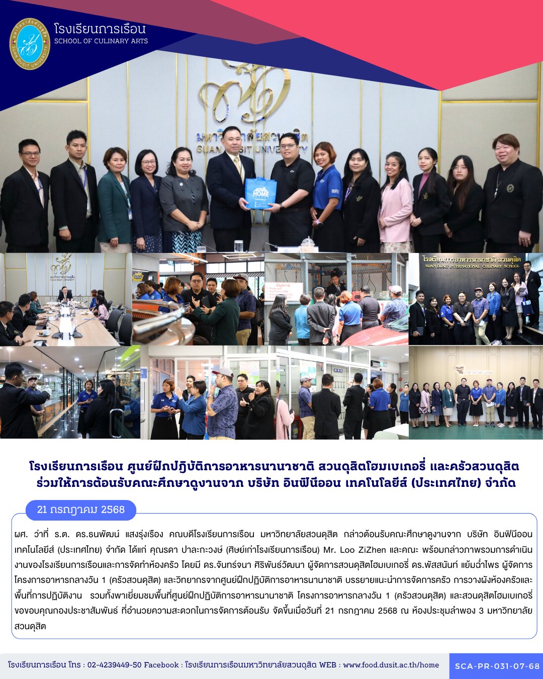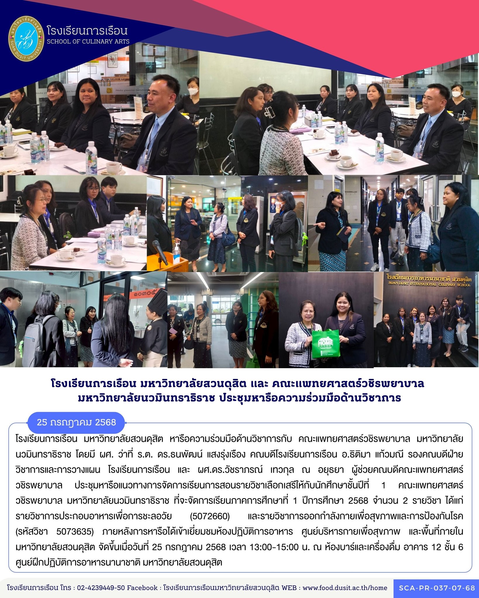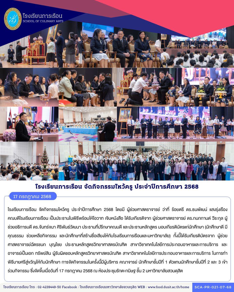 โรงเรียนการเรือน มหาวิทยาลัยสวนดุสิต โดยศูนย์ฝึกปฏิบัติการอาหารนานาชาติ จัดกิจกรรมอบรมเชิงปฏิบัติการ หลักสูตรการสุขาภิบาลอาหาร สำหรับผู้สัมผัสอาหาร ให้กับผู้เข้ารับการอบรมหลักสูตรเชฟอาหารไทยมืออาชีพ (Master Thai Chef Program) (ภาคกลาง) ภายใต้โครงการส่งเสริมซอฟต์พาวเวอร์สาขาอาหาร ประจำปีงบประมาณ พ.ศ. 2568 โดยได้รับเกียรติจาก คุณรณิดา ศรีธนาวรุณ หัวหน้าสำนักงานโรงเรียนการเรือน…