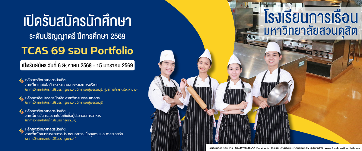 โรงเรียนการเรือน มหาวิทยาลัยสวนดุสิต โดยศูนย์ฝึกปฏิบัติการอาหารนานาชาติ จัดกิจกรรมอบรมเชิงปฏิบัติการ หลักสูตรการสุขาภิบาลอาหาร สำหรับผู้สัมผัสอาหาร ให้กับผู้เข้ารับการอบรมหลักสูตรเชฟอาหารไทยมืออาชีพ (Master Thai Chef