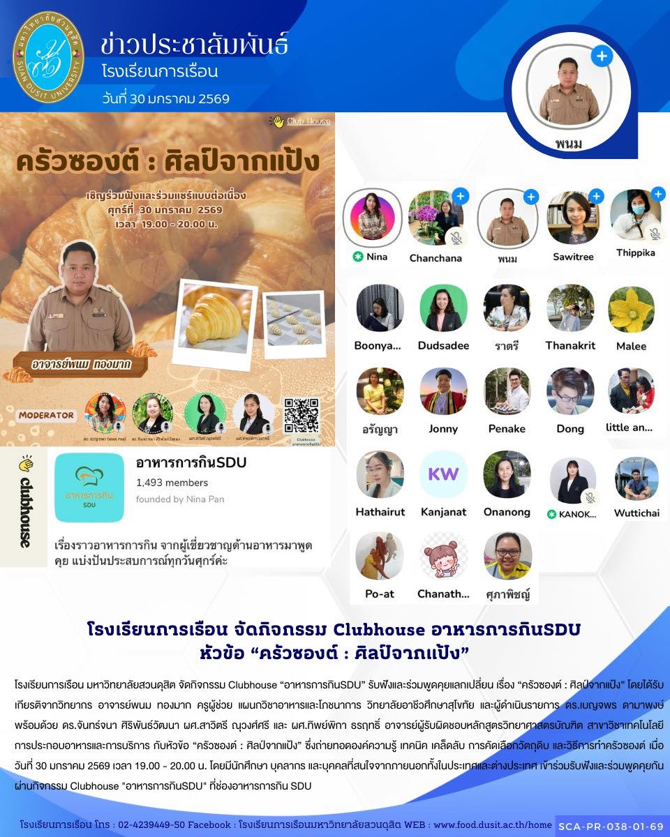 ประชาสัมพันธ์ Clubhouse คลับอาหารการกิน SDU พูดคุยในหัวข้อเรื่อง “อยากหวานแบบมีเสน่ห์… ต้องลิ้มรสด้วยสาโทข้าวเหนียวดำลืมผัวผสมกล้วยน้ำว้า”การันตีคุณภาพผลิตภัณฑ์ด้วยรางวัล Excellent จากงานประชุมวิชาการระดับชาติสวนดุสิต 2024 ครั้งที่ 6 ” วันศุกร์ที่ 19 ธันวาคม 2568 เวลา 19.00 – 20.00 น. สัปดาห์นี้ได้รับเกียรติจากอาจารย์นเรศ บางศิริ…