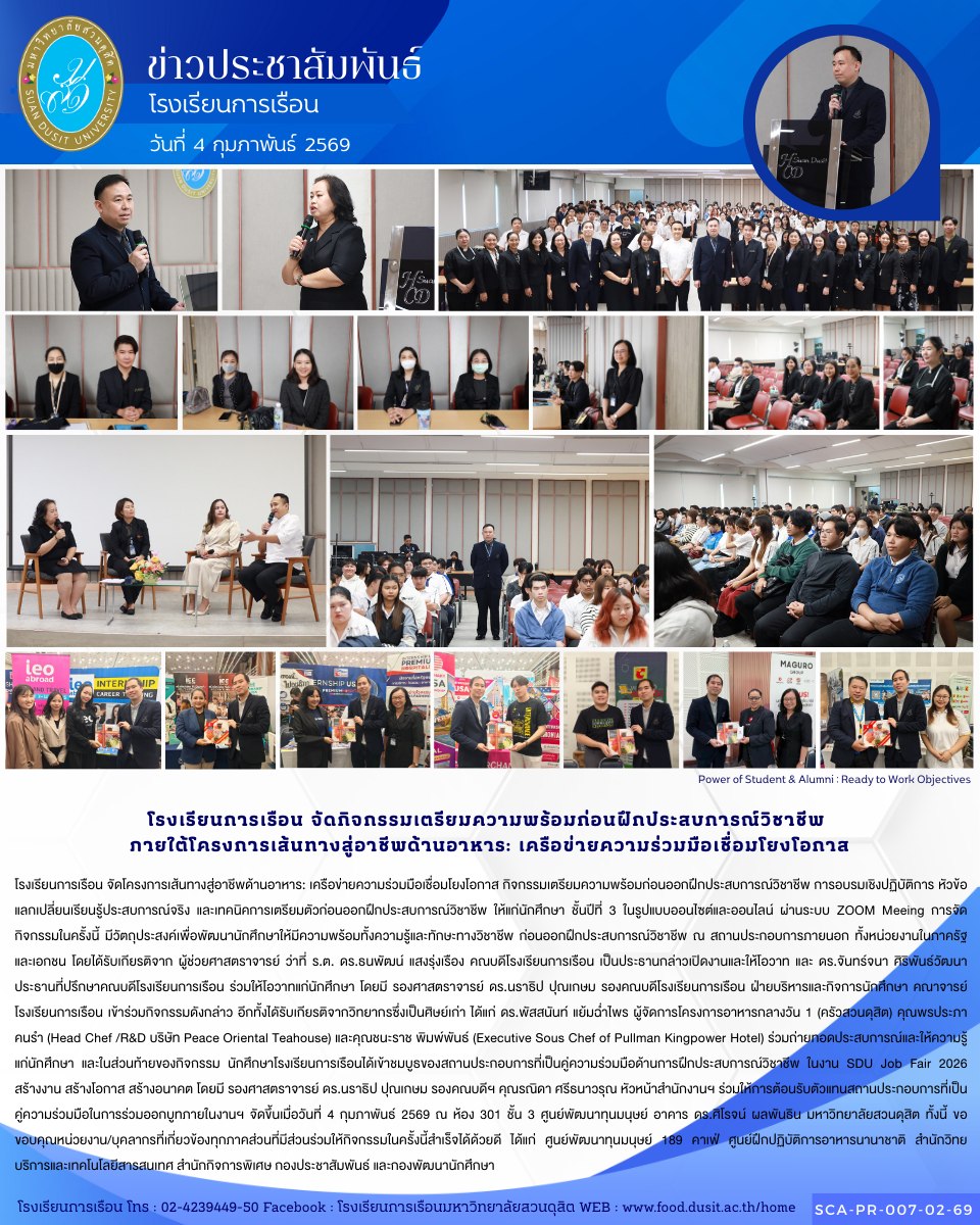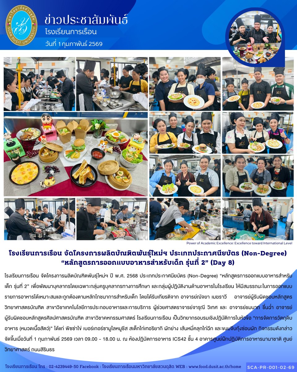 วันที่ 11 ธันวาคม 2568 ศูนย์ฝึกปฏิบัติการอาหารนานาชาติ โรงเรียนการเรือน มหาวิทยาลัยสวนดุสิต เดินทางไปสหราชอาณาจักร เพื่อสร้างความเข้มแข็งและขยายเครือข่ายความร่วมมือด้านการอาหารของโรงเรียนการเรือนในระดับนานาชาติ ร่วมกับ World City Links ภายใต้โครงการส่งเสริมความสัมพันธ์และขยายความร่วมมือ 2/2569 (ขยายความร่วมมือด้านการศึกษา ณ สหราชอาณาจักร) โดยจัดกิจกรรมสาธิต และสอนอาหารไทยให้กับนักเรียนด้านอาหาร…