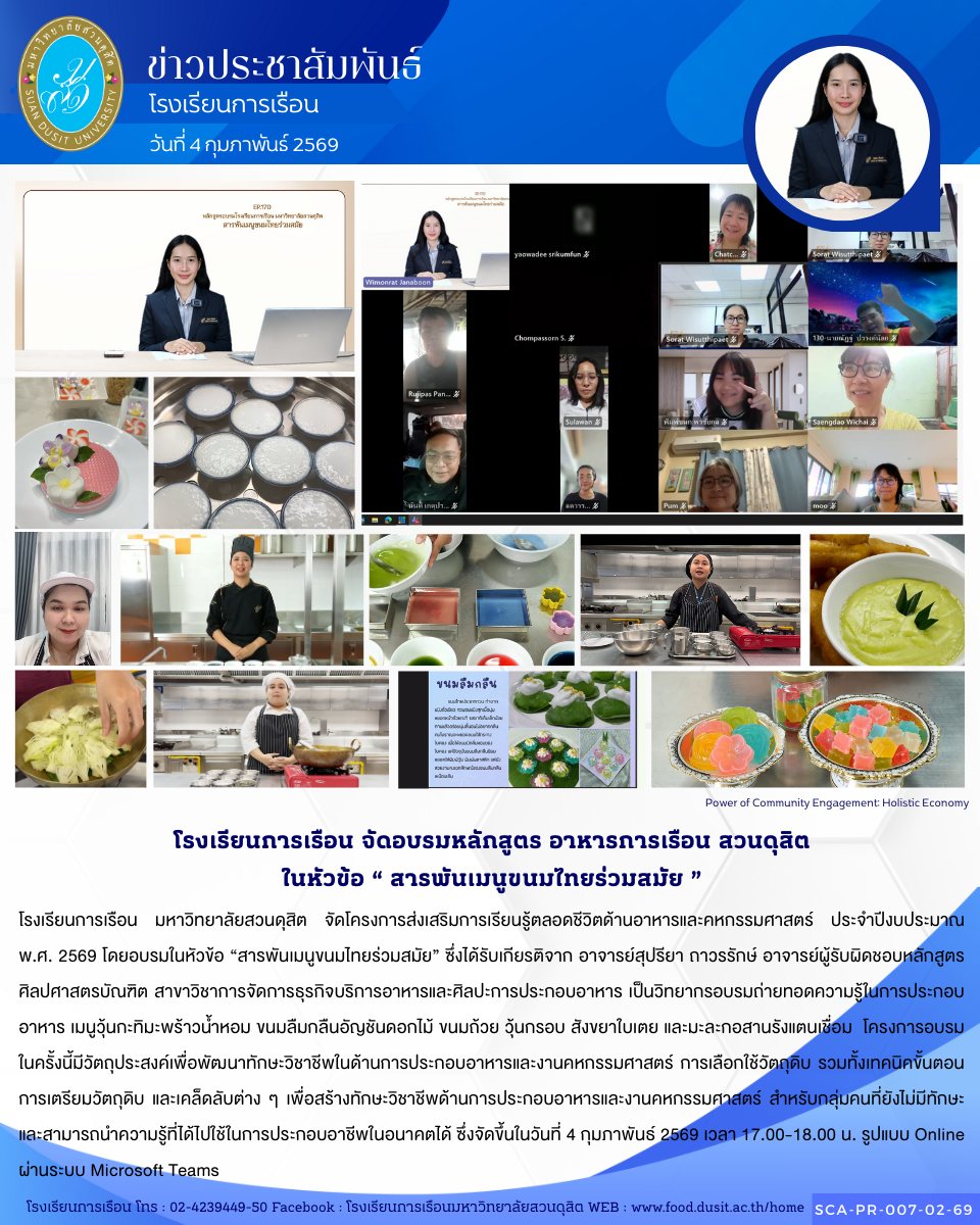 โรงเรียนการเรือน มหาวิทยาลัยสวนดุสิต จัดโครงการส่งเสริมการเรียนรู้ตลอดชีวิตด้านอาหารและคหกรรมศาสตร์ ประจำปีงบประมาณ พ.ศ. 2569 โดยอบรมในหัวข้อ “มาลองทำเบเกอรีง่าย ๆ กันเถอะ” ซึ่งได้รับเกียรติจาก ผู้ช่วยศาสตราจารย์ ดร.อัศพงษ์ อุประวรรณา อาจารย์ประจำโรงเรียนการเรือน ปฏิบัติงาน ณ ศูนย์การศึกษา ลำปาง เป็นวิทยากรอบรมถ่ายทอดความรู้ในการประกอบอาหารในเมนู…