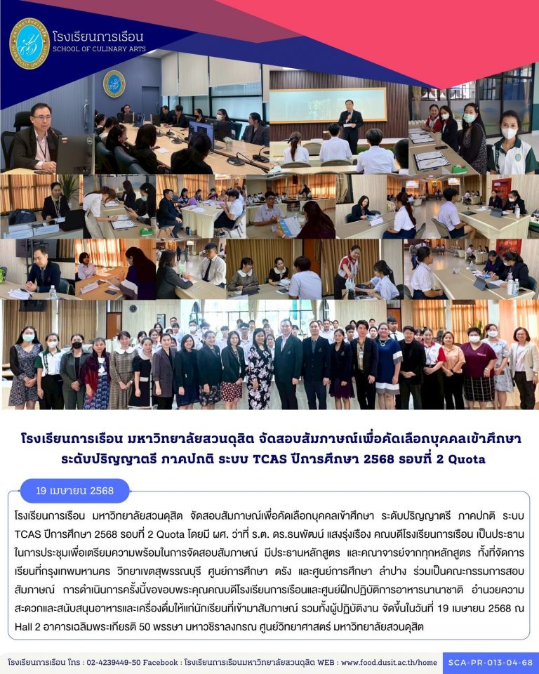 โรงเรียนการเรือน มหาวิทยาลัยสวนดุสิต จัดสอบสัมภาษณ์เพื่อคัดเลือกบุคคลเข้าศึกษา ระดับปริญญาตรี ภาคปกติ ระบบ TCAS ปีการศึกษา 2569 รอบที่ 1 Portfolio ครั้งที่ 3 โดยมี ผศ. ว่าที่ ร.ต. ดร.ธนพัฒน์ แสงรุ่งเรือง คณบดีโรงเรียนการเรือน เป็นประธานในการประชุมเพื่อเตรียมความพร้อมในการจัดสอบสัมภาษณ์ มี รองคณบดี ประธานหลักสูตร และคณาจารย์จากทุกหลักสูตร ทั้งที่จัดการเรียนที่กรุงเทพมหานคร วิทยาเขตสุพรรณบุรี ศูนย์การศึกษา ตรัง และศูนย์การศึกษา ลำปาง ร่วมเป็นคณะกรรมการสอบสัมภาษณ์ การดำเนินการครั้งนี้ ขอขอบคุณคณบดีโรงเรียนการเรือนและศูนย์ฝึกปฏิบัติการอาหารนานาชาติ อำนวยความสะดวกและสนับสนุนอาหารและเครื่องดื่มให้แก่นักเรียนที่เข้ามาสัมภาษณ์ รวมทั้งผู้ปฏิบัติงาน จัดขึ้นในวันที่ 22 พฤศจิกายน 2568 ณ ห้อง Hall 2 อาคารเฉลิมพระเกียรติ 50 พรรษา มหาวชิราลงกรณ ศูนย์วิทยาศาสตร์ มหาวิทยาลัยสวนดุสิต
