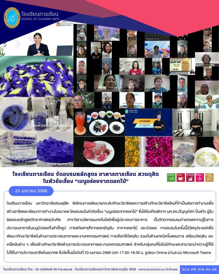 โรงเรียนการเรือน มหาวิทยาลัยสวนดุสิต จัดโครงการส่งเสริมการเรียนรู้ตลอดชีวิตด้านอาหารและคหกรรมศาสตร์ ประจำปีงบประมาณ พ.ศ. 2569 โดยอบรมในหัวข้อ “สุขภาพดีแบบไทย” ซึ่งได้รับเกียรติจาก ผู้ช่วยศาสตราจารย์ ดร.โสรัจจ์ วิสุทธิแพทย์ อาจารย์ผู้รับผิดชอบหลักสูตรวิทยาศาสตรบัณฑิต สาขาวิชาเทคโนโลยีการประกอบอาหารและการบริการ เป็นวิทยากรอบรมถ่ายทอดความรู้ในการประกอบอาหารในเมนู อาหารทางเลือกเพื่อสุขภาพ เมี่ยงคำ และ ถั่วเขียวต้มน้ำตาล โครงการอบรมในครั้งนี้มีวัตถุประสงค์เพื่อพัฒนาทักษะวิชาชีพในด้านการประกอบอาหารและงานคหกรรมศาสตร์ การเลือกใช้วัตถุดิบ รวมถึงด้านเทคนิคขั้นตอนการ เตรียมวัตถุดิบ และเคล็ดลับต่าง ๆ เพื่อสร้างทักษะวิชาชีพด้านการประกอบอาหารและงานคหกรรมศาสตร์ สำหรับกลุ่มคนที่ยังไม่มีทักษะและสามารถนำความรู้ที่ได้ไปใช้ในการประกอบอาชีพในอนาคต ซึ่งจัดขึ้นเมื่อวันที่ 26 พฤศจิกายน 2568 เวลา 17.00-18.00 น. รูปแบบ Online ผ่านระบบ Microsoft Teams