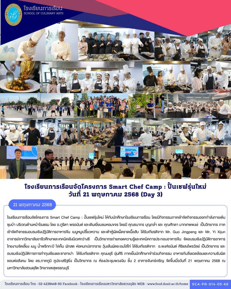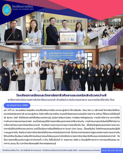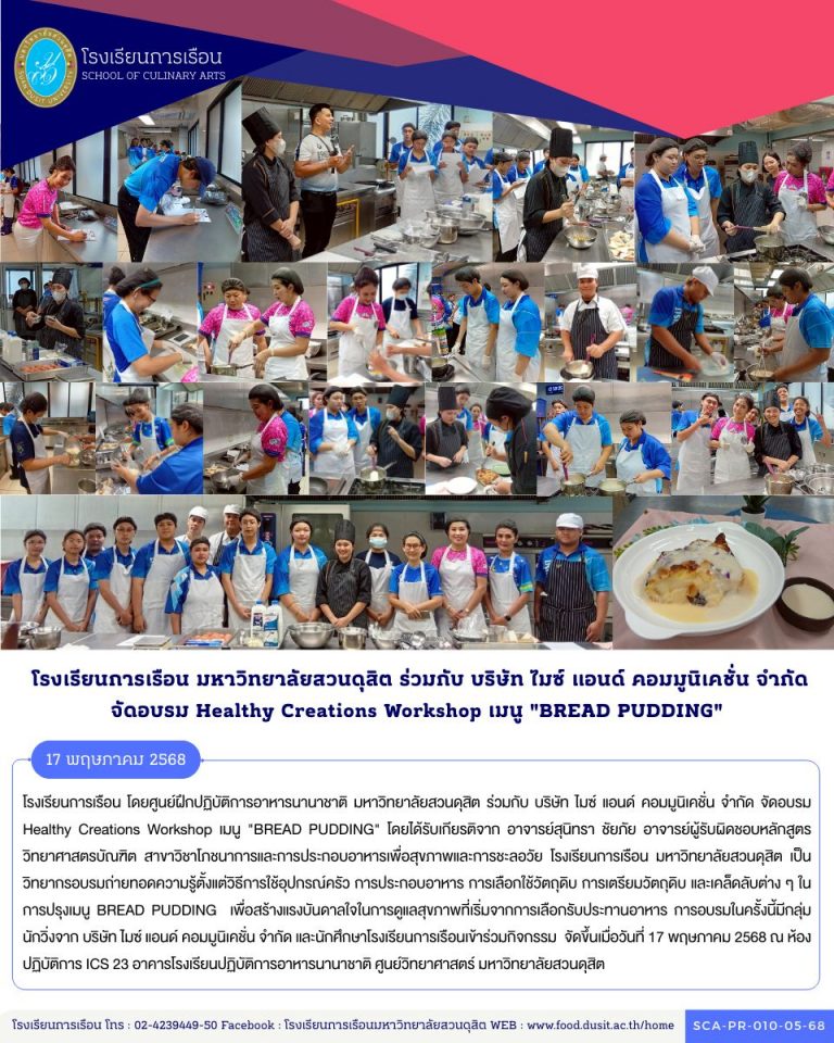 โรงเรียนการเรือน มหาวิทยาลัยสวนดุสิต ร่วมกับ ธนาคารไทยพาณิชย์ จำกัด (มหาชน) ในการจัดอบรมหลักสูตรพัฒนาทักษะ สร้างงาน สร้างอาชีพ โดยอบรมในหัวข้อ “อาหารและเบเกอรีเพื่อสุขภาพ” ซึ่งได้รับเกียรติจาก รองศาสตราจารย์ ดร.ฐิตา ฟูเผ่า ประธานหลักสูตรวิทยาศาสตรบัณฑิต สาขาวิชาโภชนาการและการประกอบอาหารเพื่อสุขภาพและการชะลอวัย เป็นวิทยากรอบรมถ่ายทอดความรู้ในการประกอบอาหาร ความรู้เกี่ยวกับโภชนาการเพื่อการชะลอวัย เมนูบราวนี่แป้งข้าวสิบเหล็ก เมนูคัพเค้กข้าวโอ๊ตกล้วยหอม และเซ็ตเมนูอาหารต้านการชะลอวัย การอบรมในครั้งนี้มีวัตถุประสงค์เพื่อพัฒนาทักษะวิชาชีพในด้านการประกอบอาหารและงานคหกรรมศาสตร์ การเลือกใช้วัตถุดิบ รวมถึงด้านเทคนิคขั้นตอนการ เตรียมวัตถุดิบ และเคล็ดลับต่าง ๆ เพื่อสร้างทักษะวิชาชีพด้านการประกอบอาหารและงานคหกรรมศาสตร์ สำหรับบุคลากรของธนาคาร ไทยพาณิชย์ จำกัด (มหาชน) ซึ่งจัดขึ้นเมื่อวันที่ 27 พฤศจิกายน 2568 เวลา 09.30-10.30 น. รูปแบบ Online ผ่านระบบ Microsoft Teams