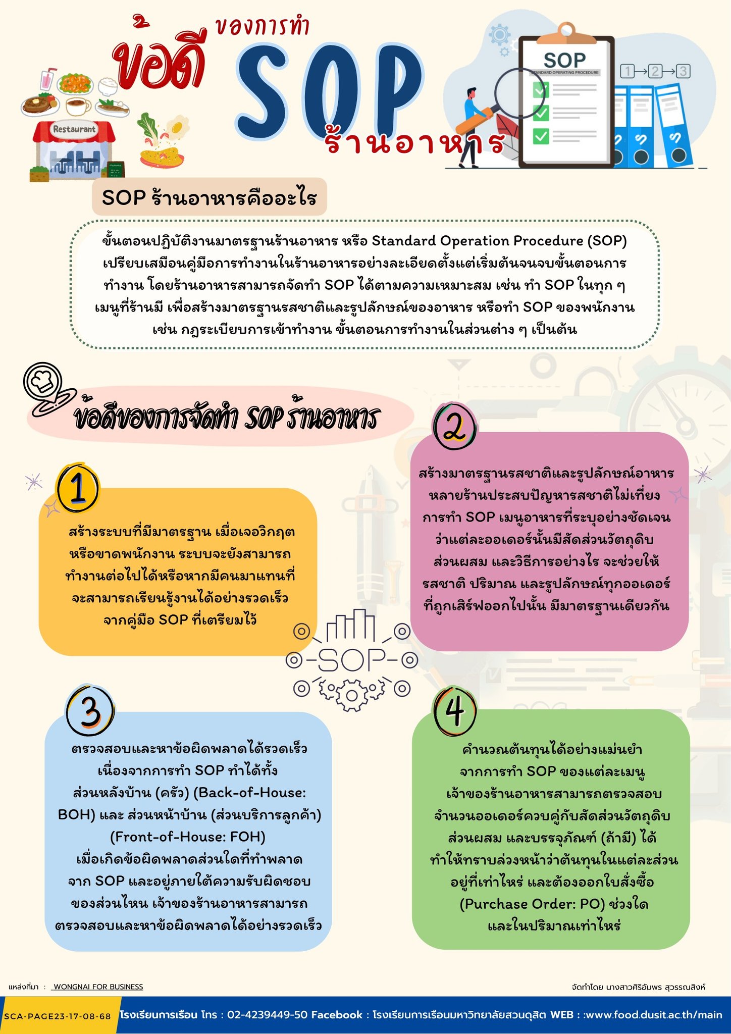 SOP ร้านอาหารคืออะไร ? ขั้นตอนปฏิบัติงานมาตรฐานร้านอาหาร หรือ Standard Operation Procedure(SOP) เปรียบเสมือนคู่มือการทำงานในร้านอาหารอย่างละเอียดตั้งแต่เริ่มต้นจนจบขั้นตอนการทำงาน โดยร้านอาหารสามารถจัดทำ SOP ได้ตามความเหมาะสม เช่น ทำ SOP ในทุกๆเมนูที่ร้านมี เพื่อสร้างมาตรฐาน รสชาติ และรูปลักษณ์ของอาหาร หรือทำ SOP ของพนักงาน เช่น กฎระเบียบการเข้าทำงาน ขั้นตอนการทำงานในส่วนต่าง ๆ เป็นต้น