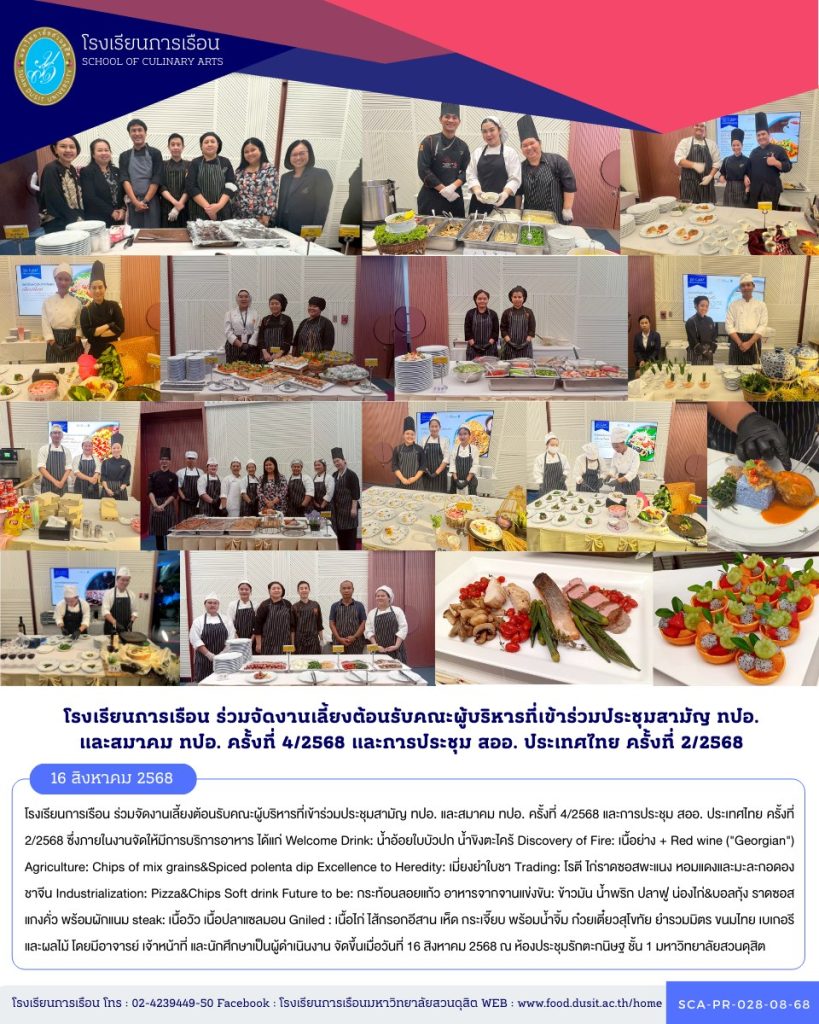 อาจารย์ บุคลากร และนักศึกษาโรงเรียนการเรือน ร่วมนำองค์ความรู้และความเชี่ยวชาญของมหาวิทยาลัยสวนดุสิต จัดกิจกรรม ชม ชิม นิทรรศการอาหารภายใต้ concept “Let’s Evolute!” การเดินทางแห่งรสชาติ: มรดกมนุษยชาติผ่านมื้ออาหาร ได้แก่ ยุคที่ 1 Discovery of Fire: เนื้อย่าง + Red wine (“Georgian”) ยุคที่ 2 Agriculture: Chips of mix grains & Spiced polenta dip ยุคที่ 3 Excellence to Heredity: เมี่ยงยำใบชา ยุคที่ 4 Trading: โรตี & ไก่ราดซอสพะแนง & หอมแดงและมะละกอดอง + ชาจีน ยุคที่ 5 Industrialization (fast and furious): Pizza & Chips + Soft drink และยุคที่ 6 Future to be: กระท้อนลอยแก้ว และเมนูอาหารจากจานแข่งขัน: (ข้าวมัน น้ำพริก ปลาฟู + น่องไก่&บอลกุ้ง ราดซอสแกงคั่ว พร้อมผักแนม) และจัดบริการอาหารจำนวน 6 ซุ้ม ได้แก่ ซุ้มที่ 1: มรดกแห่งชัยชนะ “ข้าวมันอัญชันกับแกงคั่วน่องไก่และบอลกุ้ง” ซุ้มที่ 2-3: ซิมโฟนีแห่งเปลวไฟ Steak เนื้อวัว ปลาแซลมอน เนื้อไก่ พร้อมผัก เห็ด และน้ำจิ้ม 3 อย่าง ซุ้มที่ 4: ตำนานแห่งสุโขทัย ก๋วยเตี๋ยวสุโขทัย ซุ้มที่ 5: การเต้นรำของรสเปรี้ยว ยำรวมมิตร ซุ้มที่ 6: บทส่งท้ายแห่งความหวาน ขนมไทยประณีต เบเกอรี ผลไม้ จัดขึ้นเมื่อวันที่ 16 สิงหาคม 2568 ณ หอประชุมรักตะกนิษฐ มหาวิทยาลัยสวนดุสิต