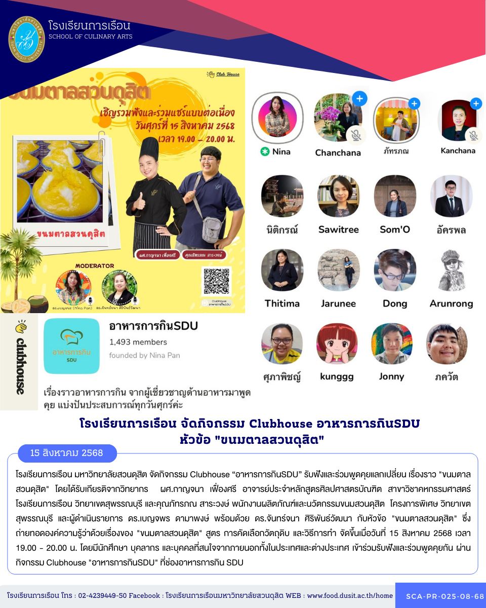 โรงเรียนการเรือน มหาวิทยาลัยสวนดุสิต จัดกิจกรรม Clubhouse “อาหารการกินSDU” รับฟังและร่วมพูดคุยแลกเปลี่ยน เรื่องราว “ขนมตาลสวนดุสิต” โดยได้รับเกียรติจากวิทยากร ผศ.กาญจนา เฟื่องศรี อาจารย์ประจำหลักสูตรศิลปศาสตรบัณฑิต สาขาวิชาคหกรรมศาสตร์ โรงเรียนการเรือน วิทยาเขตสุพรรณบุรี และคุณภัทรภณ สาระวงษ์ พนักงานผลิตภัณฑ์และนวัตกรรมขนมสวนดุสิต โครงการพิเศษ วิทยาเขตสุพรรณบุรี และผู้ดำเนินรายการ ดร.เบญจพร ดามาพงษ์ พร้อมด้วย ดร.จันทร์จนา ศิริพันธ์วัฒนา กับหัวข้อ “ขนมตาลสวนดุสิต” ซึ่งถ่ายทอดองค์ความรู้ว่าด้วยเรื่องของ “ขนมตาลสวนดุสิต” สูตร การคัดเลือกวัตถุดิบ และวิธีการทำ จัดขึ้นเมื่อวันที่ 15 สิงหาคม 2568 เวลา 19.00 – 20.00 น. โดยมีนักศึกษา บุคลากร และบุคคลที่สนใจจากภายนอกทั้งในประเทศและต่างประเทศ เข้าร่วมรับฟังและร่วมพูดคุยกัน ผ่านกิจกรรม Clubhouse “อาหารการกินSDU” ที่ช่องอาหารการกิน SDU