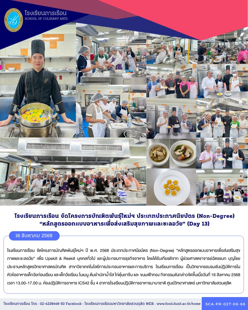 โรงเรียนการเรือน จัดโครงการบัณฑิตพันธุ์ใหม่ฯ ปี พ.ศ. 2568 ประเภทประกาศนียบัตร (Non-Degree) “หลักสูตรออกแบบอาหารเพื่อส่งเสริมสุขภาพและชะลอวัย” เพื่อ Upskill & Reskill บุคคลทั่วไป และผู้ประกอบการธุรกิจอาหาร โดยได้รับเกียรติจาก ผู้ช่วยศาสตราจารย์ฉัตรชนก บุญไชย ประธานหลักสูตรวิทยาศาสตรบัณฑิต สาขาวิชาเทคโนโลยีการประกอบอาหารและการบริการ โรงเรียนการเรือน เป็นวิทยากรอบรมเชิงปฏิบัติการในหัวข้อหลักโภชนาการ อาหารสำหรับแต่ละช่วงวัย (อาหารหญิงตั้งครรภ์ และหญิงให้นมบุตร) ในเมนู ต้มยำปลาน้ำใส ไก่ตุ๋นยาจีน และ ขนมฟักทอง กิจกรรมดังกล่าวจัดขึ้นเมื่อวันที่ 16 สิงหาคม 2568 เวลา 13.00-17.00 น. ห้องปฏิบัติการอาหาร ICS42 ชั้น 4 อาคารโรงเรียนปฏิบัติการอาหารนานาชาติ ศูนย์วิทยาศาสตร์ มหาวิทยาลัยสวนดุสิต