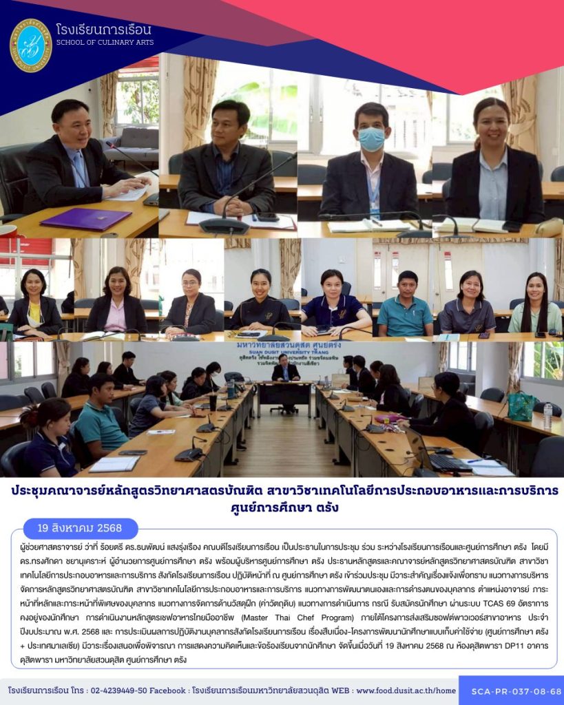 ผู้ช่วยศาสตราจารย์ ว่าที่ ร้อยตรี ดร.ธนพัฒน์ แสงรุ่งเรือง คณบดีโรงเรียนการเรือน เป็นประธานในการประชุม ร่วม ระหว่างโรงเรียนการเรือนและศูนย์การศึกษา ตรัง โดยมี ดร.ทรงศักดา ชยานุเคราะห์ ผู้อำนวยการศูนย์การศึกษา ตรัง พร้อมผู้บริหารศูนย์การศึกษา ตรัง ประธานหลักสูตรและคณาจารย์หลักสูตรวิทยาศาสตรบัณฑิต สาขาวิชาเทคโนโลยีการประกอบอาหารและการบริการ สังกัดโรงเรียนการเรือน ปฏิบัติหน้าที่ ณ ศูนย์การศึกษา ตรัง เข้าร่วมประชุม มีวาระสำคัญเรื่องแจ้งเพื่อทราบ แนวทางการบริหารจัดการหลักสูตรวิทยาศาสตรบัณฑิต สาขาวิชาเทคโนโลยีการประกอบอาหารและการบริการ แนวทางการพัฒนาตนเองและการดำรงตนของบุคลากร ตำแหน่งอาจารย์ ภาระหน้าที่หลักและภาระหน้าที่พิเศษของบุคลากร แนวทางการจัดการด้านวัสดุฝึก (ค่าวัตถุดิบ) แนวทางการดำเนินการ กรณี รับสมัครนักศึกษา ผ่านระบบ TCAS 69 อัตราการคงอยู่ของนักศึกษา การดำเนินงานหลักสูตรเชฟอาหารไทยมืออาชีพ (Master Thai Chef Program) ภายใต้โครงการส่งเสริมซอฟต์พาวเวอร์สาขาอาหาร ประจำปีงบประมาณ พ.ศ. 2568 และ การประเมินผลการปฏิบัติงานบุคลากรสังกัดโรงเรียนการเรือน เรื่องสืบเนื่อง-โครงการพัฒนานักศึกษาแบบเก็บค่าใช้จ่าย (ศูนย์การศึกษา ตรัง + ประเทศมาเลเซีย) มีวาระเรื่องเสนอเพื่อพิจารณา การแสดงความคิดเห็นและข้อร้องเรียนจากนักศึกษา จัดขึ้นเมื่อวันที่ 19 สิงหาคม 2568 ณ ห้องดุสิตพารา DP11 อาคารดุสิตพารา มหาวิทยาลัยสวนดุสิต ศูนย์การศึกษา ตรัง