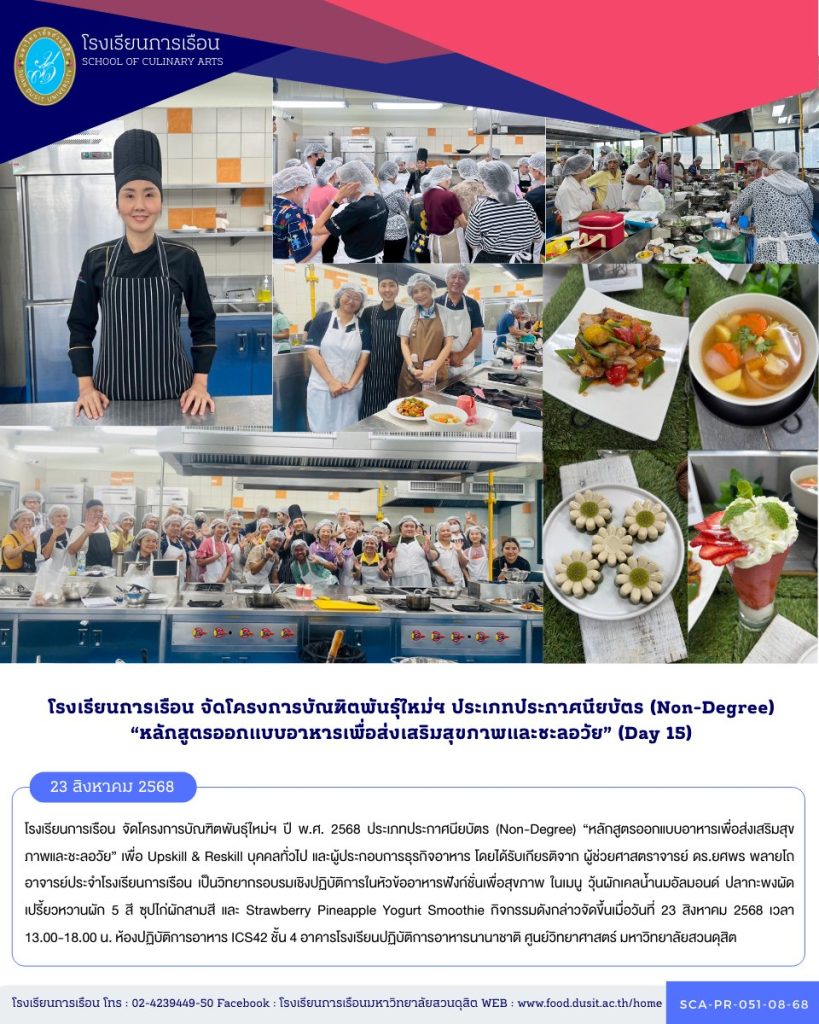 โรงเรียนการเรือน จัดโครงการบัณฑิตพันธุ์ใหม่ฯ ปี พ.ศ. 2568 ประเภทประกาศนียบัตร (Non-Degree) “หลักสูตรออกแบบอาหารเพื่อส่งเสริมสุขภาพและชะลอวัย” เพื่อ Upskill & Reskill บุคคลทั่วไป และผู้ประกอบการธุรกิจอาหาร โดยได้รับเกียรติจาก ผู้ช่วยศาสตราจารย์ ดร.ยศพร พลายโถ อาจารย์ประจำโรงเรียนการเรือน เป็นวิทยากรอบรมเชิงปฏิบัติการในหัวข้ออาหารฟังก์ชั่นเพื่อสุขภาพ ในเมนู วุ้นผักเคลน้ำนมอัลมอนด์ ปลากะพงผัดเปรี้ยวหวานผัก 5 สี ซุปไก่ผักสามสี และ Strawberry Pineapple Yogurt Smoothie กิจกรรมดังกล่าวจัดขึ้นเมื่อวันที่ 23 สิงหาคม 2568 เวลา 13.00-18.00 น. ห้องปฏิบัติการอาหาร ICS42 ชั้น 4 อาคารโรงเรียนปฏิบัติการอาหารนานาชาติ ศูนย์วิทยาศาสตร์ มหาวิทยาลัยสวนดุสิต