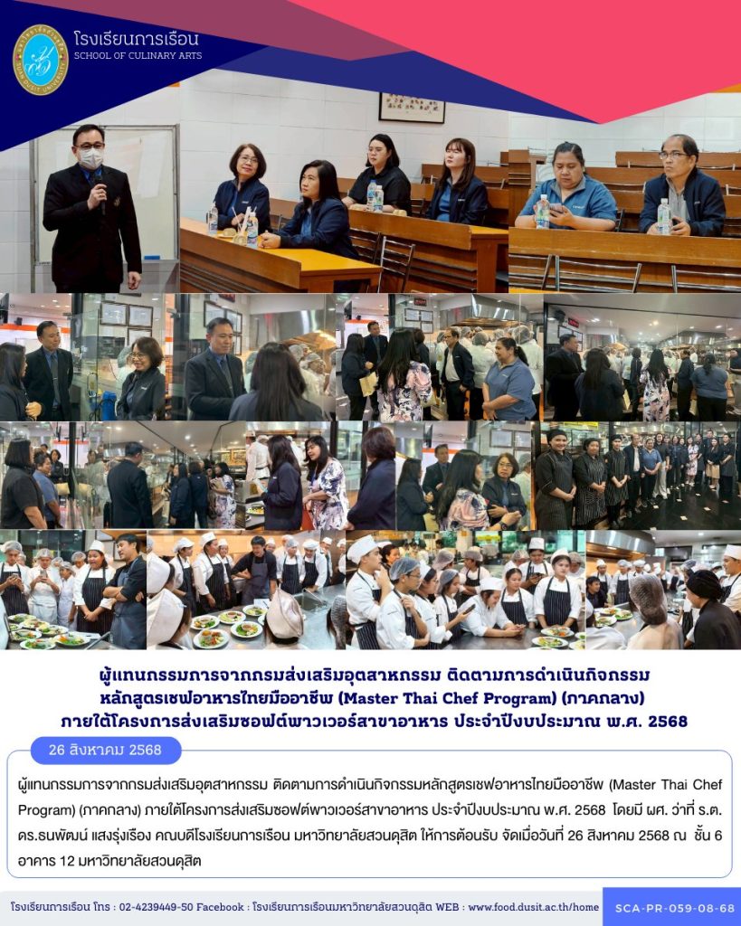 ผู้แทนกรรมการจากกรมส่งเสริมอุตสาหกรรม ติดตามการดำเนินกิจกรรมหลักสูตรเชฟอาหารไทยมืออาชีพ (Master Thai Chef Program) (ภาคกลาง) ภายใต้โครงการส่งเสริมซอฟต์พาวเวอร์สาขาอาหาร ประจำปีงบประมาณ พ.ศ. 2568 โดยมี ผศ. ว่าที่ ร.ต. ดร.ธนพัฒน์ แสงรุ่งเรือง คณบดีโรงเรียนการเรือน มหาวิทยาลัยสวนดุสิต ให้การต้อนรับ จัดเมื่อวันที่ 26 สิงหาคม 2568 ณ ชั้น 6 อาคาร 12 มหาวิทยาลัยสวนดุสิต