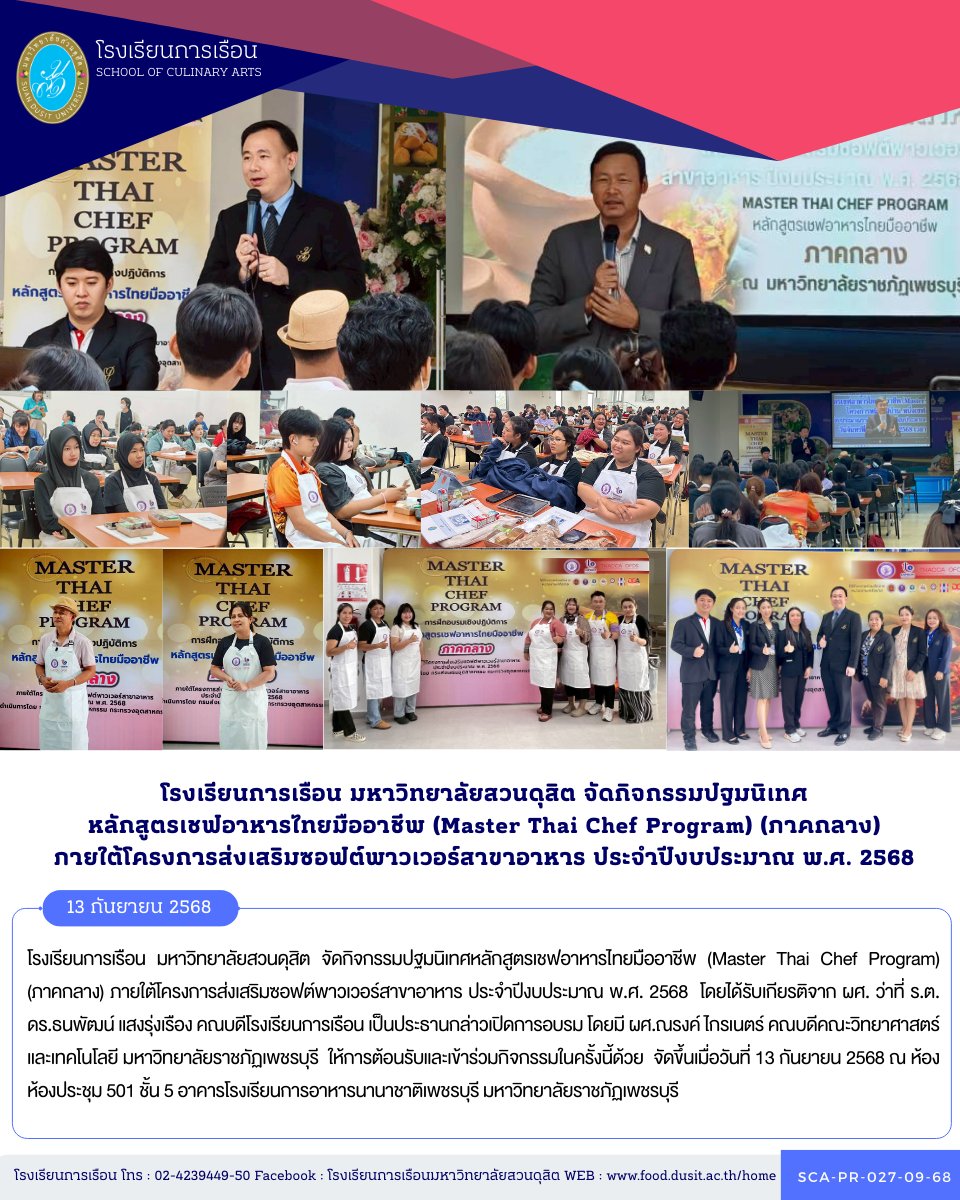 โรงเรียนการเรือน มหาวิทยาลัยสวนดุสิต จัดกิจกรรมปฐมนิเทศหลักสูตรเชฟอาหารไทยมืออาชีพ (Master Thai Chef Program) (ภาคกลาง) ภายใต้โครงการส่งเสริมซอฟต์พาวเวอร์สาขาอาหาร ประจำปีงบประมาณ พ.ศ. 2568 โดยได้รับเกียรติจาก ผศ. ว่าที่ ร.ต. ดร.ธนพัฒน์ แสงรุ่งเรือง คณบดีโรงเรียนการเรือน เป็นประธานกล่าวเปิดการอบรม โดยมี ผศ.ณรงค์ ไกรเนตร์ คณบดีคณะวิทยาศาสตร์และเทคโนโลยี มหาวิทยาลัยราชภัฏเพชรบุรี ให้การต้อนรับและเข้าร่วมกิจกรรมในครั้งนี้ด้วย จัดขึ้นเมื่อวันที่ 13 กันยายน 2568 ณ ห้องห้องประชุม 501 ชั้น 5 อาคารโรงเรียนการอาหารนานาชาติเพชรบุรี มหาวิทยาลัยราชภัฏเพชรบุรี