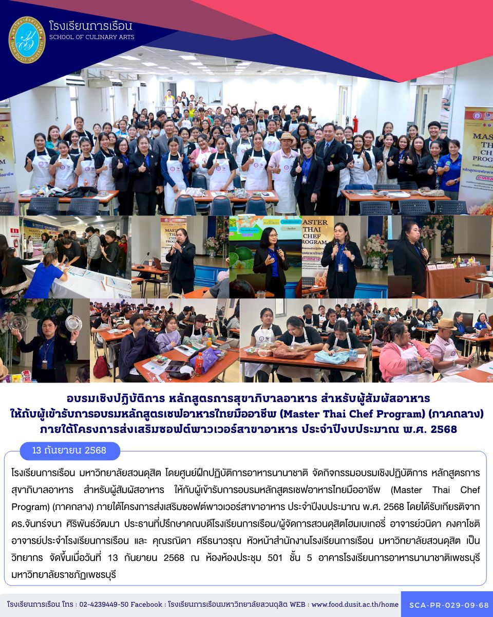 โรงเรียนการเรือน มหาวิทยาลัยสวนดุสิต โดยศูนย์ฝึกปฏิบัติการอาหารนานาชาติ จัดกิจกรรมอบรมเชิงปฏิบัติการ หลักสูตรการสุขาภิบาลอาหาร สำหรับผู้สัมผัสอาหาร ให้กับผู้เข้ารับการอบรมหลักสูตรเชฟอาหารไทยมืออาชีพ (Master Thai Chef Program) (ภาคกลาง) ภายใต้โครงการส่งเสริมซอฟต์พาวเวอร์สาขาอาหาร ประจำปีงบประมาณ พ.ศ. 2568