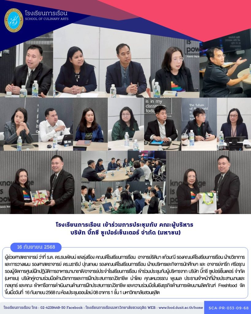 ผู้ช่วยศาสตราจารย์ ว่าที่ ร.ต. ดร.ธนพัฒน์ แสงรุ่งเรือง คณบดีโรงเรียนการเรือน อาจารย์ธิติมา แก้วมณี รองคณบดีโรงเรียนการเรือน ฝ่ายวิชาการและการวางแผน รองศาสตราจารย์ ดร.นราธิป ปุณเกษม รองคณบดีโรงเรียนการเรือน ฝ่ายบริหารและกิจการนักศึกษา และ อาจารย์จารึก ศรีอรุณ รองผู้จัดการศูนย์ฝึกปฏิบัติการอาหารนานาชาติ/อาจารย์ประจำโรงเรียนการเรือน เข้าร่วมประชุมกับผู้บริหารจาก บริษัท บิ๊กซี ซูเปอร์เซ็นเตอร์ จำกัด (มหาชน) บริษัทคู่ความร่วมมือด้านวิชาการและการฝึกประสบการณ์วิชาชีพ นำโดย คุณเหมวรรณ พูนผล ประธานเจ้าหน้าที่ฝ่ายประสานงานและกลยุทธ์ และคณะ เข้าหารือการดำเนินงานด้านการฝึกประสบการณ์วิชาชีพ และความร่วมมือในเชิงธุรกิจด้านการพัฒนาผลิตภัณฑ์ Freshfood จัดขึ้นเมื่อวันที่ 16 กันยายน 2568 ณ ห้องประชุมออนไลน์ 08 อาคาร 1 ชั้น 1 มหาวิทยาลัยสวนดุสิต