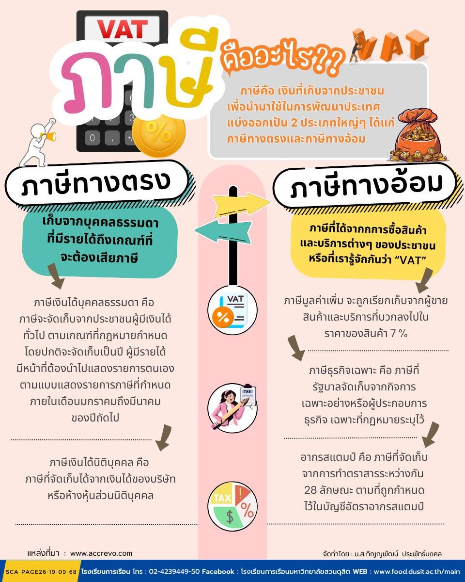 ภาษี หมายถึง เงินที่เก็บจากประชาชน เพื่อนำมาใช้ในการพัฒนาประเทศ แบ่งออกเป็น 2 ประเภทใหญ่ ๆ ได้แก่ ภาษีทางตรงและภาษีทางอ้อม