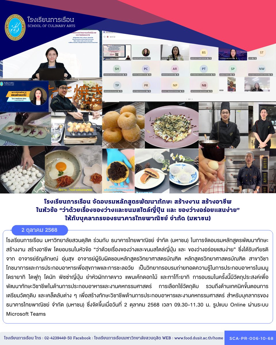 โรงเรียนการเรือน มหาวิทยาลัยสวนดุสิต ร่วมกับ ธนาคารไทยพาณิชย์ จำกัด (มหาชน) ในการจัดอบรมหลักสูตรพัฒนาทักษะ สร้างงาน สร้างอาชีพ โดยอบรมในหัวข้อ “ว่าด้วยเรื่องของว่างและขนมสไตล์ญี่ปุ่น และ ของว่างอร่อยแสนง่าย” ซึ่งได้รับเกียรติจาก อาจารย์ธัญลักษณ์ อุ่นสุข อาจารย์ผู้รับผิดชอบหลักสูตรวิทยาศาสตรบัณฑิต หลักสูตรวิทยาศาสตรบัณฑิต สาขาวิชาโภชนาการและการประกอบอาหารเพื่อสุขภาพและการชะลอวัย เป็นวิทยากรอบรมถ่ายทอดความรู้ในการประกอบอาหารในเมนูโดรายากิ ไดฟูกุ โดนัท พิซซ่าญี่ปุ่น ยำหัวผักกาดขาว แพนเค้กดอกไม้ และทาโก๊ะยากิ การอบรมในครั้งนี้มีวัตถุประสงค์เพื่อพัฒนาทักษะวิชาชีพในด้านการประกอบอาหารและงานคหกรรมศาสตร์ การเลือกใช้วัตถุดิบ รวมถึงด้านเทคนิคขั้นตอนการ เตรียมวัตถุดิบ และเคล็ดลับต่าง ๆ เพื่อสร้างทักษะวิชาชีพด้านการประกอบอาหารและงานคหกรรมศาสตร์ สำหรับบุคลากรของธนาคารไทยพาณิชย์ จำกัด (มหาชน) ซึ่งจัดขึ้นเมื่อวันที่ 2 ตุลาคม 2568 เวลา 09.30-11.30 น. รูปแบบ Online ผ่านระบบ Microsoft Teams