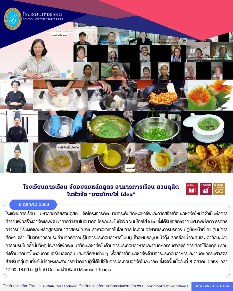 โรงเรียนการเรือน มหาวิทยาลัยสวนดุสิต จัดโครงการพัฒนายกระดับทักษะวิชาชีพและการสร้างทักษะวิชาชีพใหม่ที่จำเป็นต่อการทำงานเพื่อสร้างอาชีพและพัฒนาการทำงานในอนาคต โดยอบรมในหัวข้อ ขนมไทยใส่ Idea ซึ่งได้รับเกียรติจาก ผศ.ทิพย์พิกา ธรฤทธิ์ อาจารย์ผู้รับผิดชอบหลักสูตรวิทยาศาสตรบัณฑิต สาขาวิชาเทคโนโลยีการประกอบอาหารและการบริการ ปฏิบัติหน้าที่ ณ ศูนย์การศึกษา ตรัง เป็นวิทยากรอบรมถ่ายทอดความรู้ในการประกอบอาหารในเมนู ข้าวเหนียวมูนหน้ากุ้ง ลอดช่องน้ำกะทิ และ อาลัวมะม่วง การอบรมในครั้งนี้มีวัตถุประสงค์เพื่อพัฒนาทักษะวิชาชีพในด้านการประกอบอาหารและงานคหกรรมศาสตร์ การเลือกใช้วัตถุดิบ รวมถึงด้านเทคนิคขั้นตอนการ เตรียมวัตถุดิบ และเคล็ดลับต่าง ๆ เพื่อสร้างทักษะวิชาชีพด้านการประกอบอาหารและงานคหกรรมศาสตร์ สำหรับกลุ่มคนที่ยังไม่มีทักษะและสามารถนำความรู้ที่ได้ไปใช้ในการประกอบอาชีพในอนาคต ซึ่งจัดขึ้นเมื่อวันที่ 8 ตุลาคม 2568 เวลา 17.00-18.00 น. รูปแบบ Online ผ่านระบบ Microsoft Teams