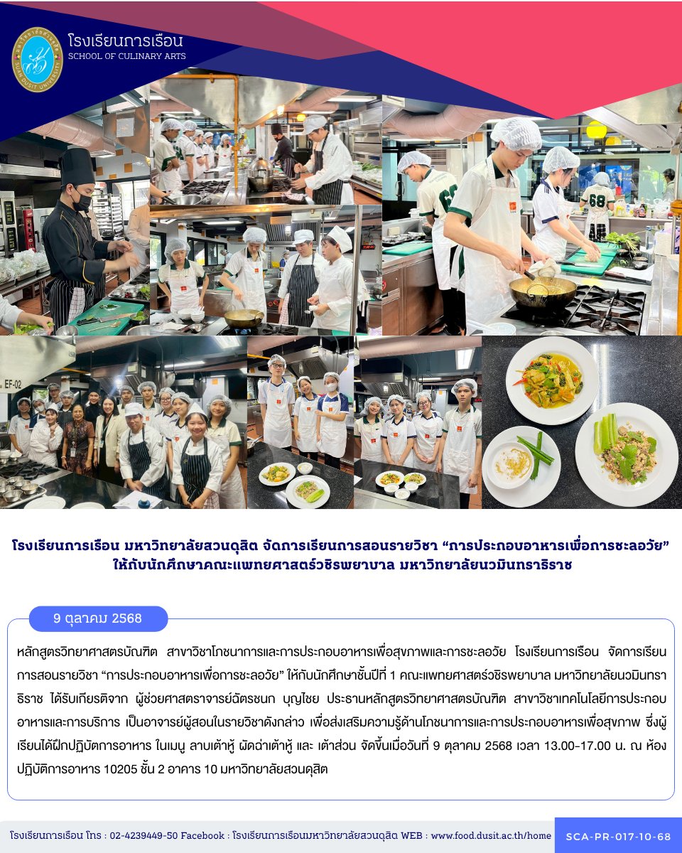 หลักสูตรวิทยาศาสตรบัณฑิต สาขาวิชาโภชนาการและการประกอบอาหารเพื่อสุขภาพและการชะลอวัย โรงเรียนการเรือน จัดการเรียนการสอนรายวิชา “การประกอบอาหารเพื่อการชะลอวัย” ให้กับนักศึกษาชั้นปีที่ 1 คณะแพทยศาสตร์วชิรพยาบาล มหาวิทยาลัยนวมินทราธิราช ได้รับเกียรติจาก ผู้ช่วยศาสตราจารย์ฉัตรชนก บุญไชย ประธานหลักสูตรวิทยาศาสตรบัณฑิต สาขาวิชาเทคโนโลยีการประกอบอาหารและการบริการ เป็นอาจารย์ผู้สอนในรายวิชาดังกล่าว เพื่อส่งเสริมความรู้ด้านโภชนาการและการประกอบอาหารเพื่อสุขภาพ ซึ่งผู้เรียนได้ฝึกปฏิบัตการอาหาร ในเมนู ลาบเต้าหู้ ผัดฉ่าเต้าหู้ และ เต้าส่วน จัดขึ้นเมื่อวันที่ 9 ตุลาคม 2568 เวลา 13.00-17.00 น. ณ ห้องปฏิบัติการอาหาร 10205 ชั้น 2 อาคาร 10 มหาวิทยาลัยสวนดุสิต