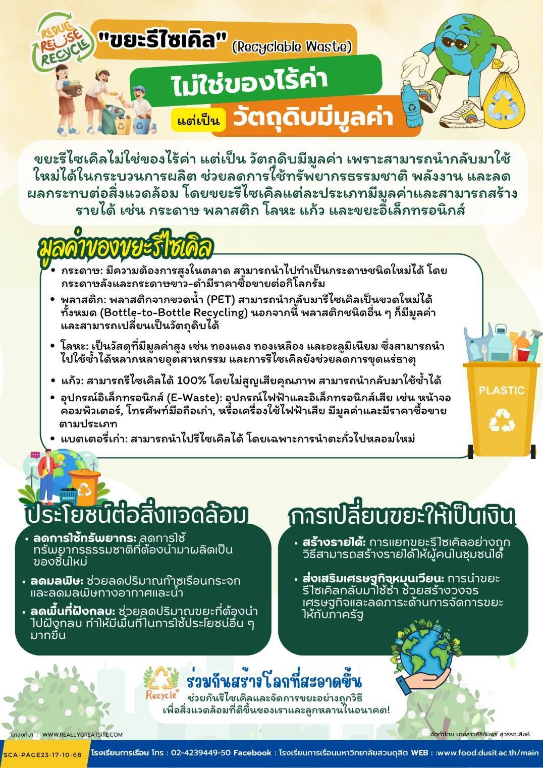 ขยะรีไซเคิลไม่ใช่ของไร้ค่าแต่เป็นวัตถุดิบมีมูลค่าเพราะสามารถนำกลับมาใช้ใหม่ได้ในกระบวนการผลิต ช่วยลดการใช้ทรัพยากรธรรมชาติ พลังงานและลดผลกระทบต่อสิ่งแวดล้อม โดยขยะรีไซเคิลแต่ละประเภทมีมูลค่าและสามารถสร้างรายได้ เช่น กระดาษ พลาสติก โลหะ แก้ว และขยะอิเล็กทรอนิกส์