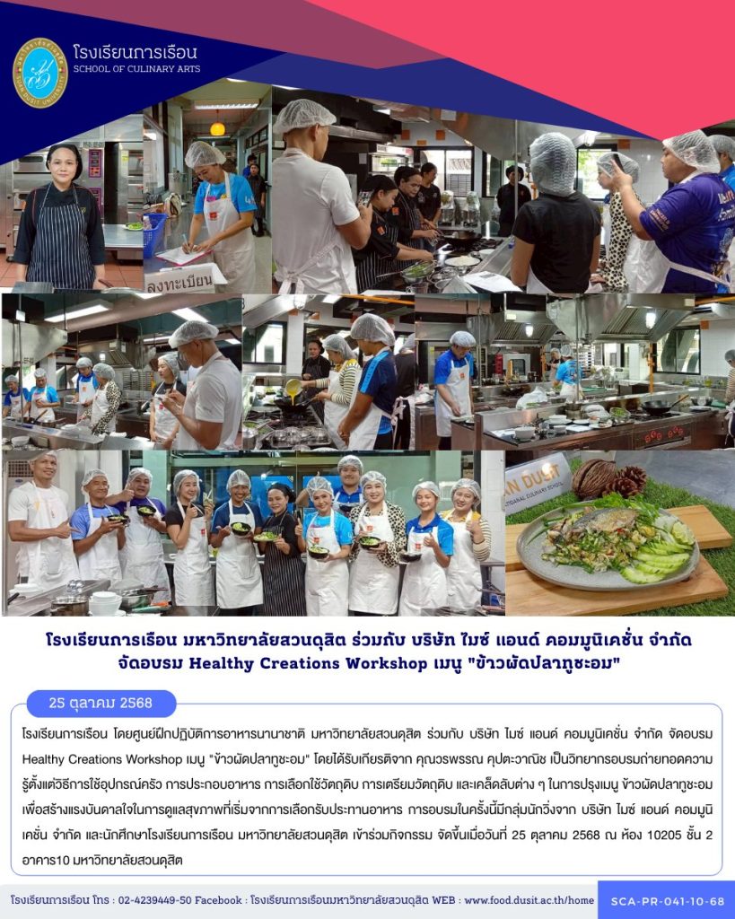 โรงเรียนการเรือน โดยศูนย์ฝึกปฏิบัติการอาหารนานาชาติ มหาวิทยาลัยสวนดุสิต ร่วมกับ บริษัท ไมซ์ แอนด์ คอมมูนิเคชั่น จำกัด จัดอบรม Healthy Creations Workshop เมนู “ข้าวผัดปลาทูชะอม” โดยได้รับเกียรติจาก คุณวรพรรณ คุปตะวาณิช เป็นวิทยากรอบรมถ่ายทอดความรู้ตั้งแต่วิธีการใช้อุปกรณ์ครัว การประกอบอาหาร การเลือกใช้วัตถุดิบ การเตรียมวัตถุดิบ และเคล็ดลับต่าง ๆ ในการปรุงเมนู ข้าวผัดปลาทูชะอม เพื่อสร้างแรงบันดาลใจในการดูแลสุขภาพที่เริ่มจากการเลือกรับประทานอาหาร การอบรมในครั้งนี้มีกลุ่มนักวิ่งจาก บริษัท ไมซ์ แอนด์ คอมมูนิเคชั่น จำกัด และนักศึกษาโรงเรียนการเรือน มหาวิทยาลัยสวนดุสิต เข้าร่วมกิจกรรม จัดขึ้นเมื่อวันที่ 25 ตุลาคม 2568 ณ ห้อง 10205 ชั้น 2 อาคาร10 มหาวิทยาลัยสวนดุสิต