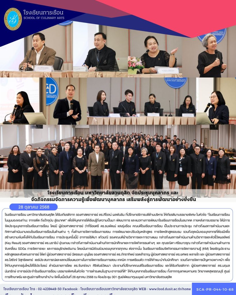 โรงเรียนการเรือน มหาวิทยาลัยสวนดุสิต ได้รับเกียรติจาก รองศาสตราจารย์ ดร.ศิโรจน์ ผลพันธิน ที่ปรึกษาอธิการบดีด้านบริหาร ให้เกียรติมาบรรยายพิเศษ ในหัวข้อ “โรงเรียนการเรือนในมุมมองของท่าน: จากอดีต ถึงปัจจุบัน สู่อนาคต” เพื่อให้บุคลากรได้เรียนรู้ถึงความเป็นมา พัฒนาการ และแนวทางการพัฒนาโรงเรียนการเรือนในอนาคต ภายหลังการบรรยาย ได้มีการจัดประชุมบุคลากรโรงเรียนการเรือน โดยมี ผู้ช่วยศาสตราจารย์ ว่าที่ร้อยตรี ดร.ธนพัฒน์ แสงรุ่งเรือง คณบดีโรงเรียนการเรือน เป็นประธานการประชุม กล่าวถึงผลการดำเนินงานและทิศทางดำเนินงานของโรงเรียนการเรือนในด้านต่าง ๆ ทั้งด้านการจัดการเรียนการสอน การพัฒนาและปรับปรุงหลักสูตร การจัดหลักสูตรอบรม รวมถึงจุดเน้นของบุคลากรที่ต้องมีเพื่อสร้างความเข้มแข็งให้กับโรงเรียนการเรือน การประชุมครั้งนี้มี อาจารย์ธิติมา แก้วมณี รองคณบดีฝ่ายวิชาการและการวางแผน กล่าวถึงผลการดำเนินงานด้านวิชาการและตัวชี้วัดผลลัพธ์ (Key Result) รองศาสตราจารย์ ดร.นราธิป ปุณเกษม กล่าวถึงการดำเนินงานด้านกิจการนักศึกษาและการจัดกิจกรรมต่างๆ และ คุณรณิดา ศรีธนาวรุณ กล่าวถึงการดำเนินงานด้านการขับเคลื่อน SDGs การจัดการขยะ และการอนุรักษ์พลังงาน โดยเน้นการมีส่วนร่วมของบุคลากรทุกคน ต่อจากนั้น โรงเรียนการเรือนจัดกิจกรรมการจัดการความรู้ (KM) โดยเชิญประธานหลักสูตรและตัวแทนอาจารย์ ได้แก่ ผู้ช่วยศาสตราจารย์ ฉัตรชนก บุญไชย รองศาสตราจารย์ ดร.ภัทราทิพย์ รอดสำราญ ผู้ช่วยศาสตราจารย์ ดร.ยศพร พลายโถ และ ผู้ช่วยศาสตราจารย์ ดร.โสรัจจ์ วิสุทธิแพทย์ แชร์ประสบการณ์และแลกเปลี่ยนแนวทางในการจัดการเรียนการสอน เทคนิค การเตรียมตัว การให้คำแนะนำกับนักศึกษา รวมถึงการจัดการปัญหาเฉพาะหน้า เพื่อให้กับบุคลากรรุ่นใหม่ได้ใช้ประโยชน์ ดำเนินรายการโดย ดร.จันทร์จนา ศิริพันธ์วัฒนา ประธานที่ปรึกษาคณบดีโรงเรียนการเรือน และได้รับเกียรติจาก ผู้ช่วยศาสตราจารย์ ดร.นฤมล นันทรักษ์ อาจารย์ประจำโรงเรียนการเรือน บรรยายพิเศษในหัวข้อ “การดำรงตนในฐานะอาจารย์ที่ดี” ให้กับบุคลากรโรงเรียนการเรือน ทั้งจากกรุงเทพมหานคร วิทยาเขตสุพรรณบุรี ศูนย์การศึกษาตรัง และศูนย์การศึกษาลำปาง จัดขึ้นเมื่อวันที่ 28 ตุลาคม 2568 ณ ห้องประชุม 301 ศูนย์พัฒนาทุนมนุษย์ มหาวิทยาลัยสวนดุสิต