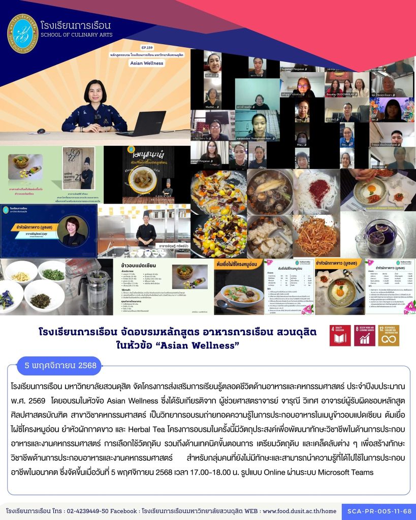 โรงเรียนการเรือน มหาวิทยาลัยสวนดุสิต จัดโครงการส่งเสริมการเรียนรู้ตลอดชีวิตด้านอาหารและคหกรรมศาสตร์ ประจำปีงบประมาณ พ.ศ. 2569 โดยอบรมในหัวข้อ Asian Wellness ซึ่งได้รับเกียรติจาก ผู้ช่วยศาสตราจารย์ จารุณี วิเทศ อาจารย์ผู้รับผิดชอบหลักสูตศิลปศาสตรบัณฑิต สาขาวิชาคหกรรมศาสตร์ เป็นวิทยากรอบรมถ่ายทอดความรู้ในการประกอบอาหารในเมนูข้าวอบแปดเซียน ต้มเยื่อไผ่ซี่โครงหมูอ่อน ยำหัวผักกาดขาว และ Herbal Tea โครงการอบรมในครั้งนี้มีวัตถุประสงค์เพื่อพัฒนาทักษะวิชาชีพในด้านการประกอบอาหารและงานคหกรรมศาสตร์ การเลือกใช้วัตถุดิบ รวมถึงด้านเทคนิคขั้นตอนการ เตรียมวัตถุดิบ และเคล็ดลับต่าง ๆ เพื่อสร้างทักษะวิชาชีพด้านการประกอบอาหารและงานคหกรรมศาสตร์ สำหรับกลุ่มคนที่ยังไม่มีทักษะและสามารถนำความรู้ที่ได้ไปใช้ในการประกอบอาชีพในอนาคต ซึ่งจัดขึ้นเมื่อวันที่ 5 พฤศจิกายน 2568 เวลา 17.00-18.00 น. รูปแบบ Online ผ่านระบบ Microsoft Teams