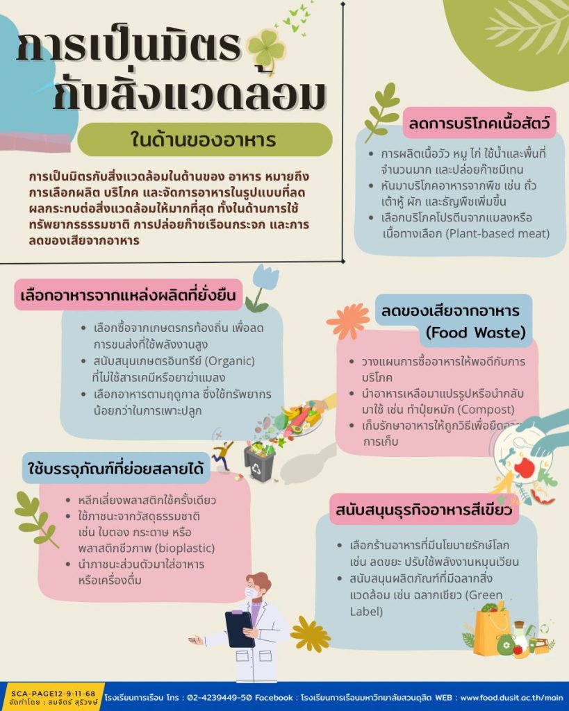การเป็นมิตรกับสิ่งแวดล้อมในด้านของอาหาร (Environmentally Friendly in Food) เป็นเรื่องที่สำคัญมากในปัจจุปัน เพราะ “อาหาร” เกี่ยวข้องกับการผลิต การขนส่ง และการบริโภค ซึ่งล้วนมีผลต่อสิ่งแวดล้อมโดยตรง การเลือกอาหารทึ่ดี มีการผลิตและการจัดการที่ดี เป็นสิ่งที่ทุกคนสามารถทำได้ ซึ่งการปรับเปลี่ยนพฤติกรรมเล็กๆ เหล่านี้ จะช่วยลดปัญหาสิ่งแวดล้อม และสร้างระบบอาหารที่ยั่งยืน เพื่อโลกที่น่าอยู่สำหรับคนรุ่นต่อไป
