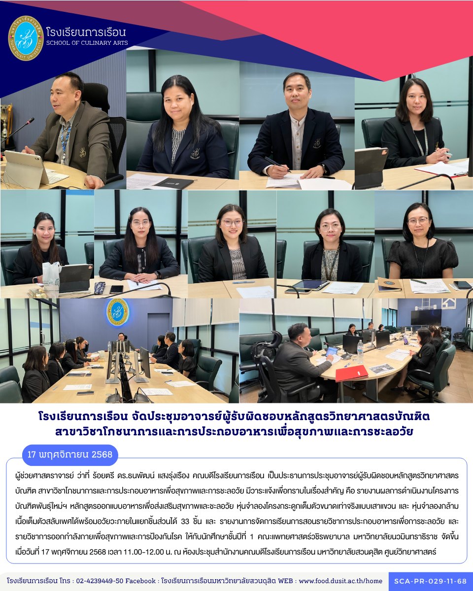 ผู้ช่วยศาสตราจารย์ ว่าที่ ร้อยตรี ดร.ธนพัฒน์ แสงรุ่งเรือง คณบดีโรงเรียนการเรือน เป็นประธานการประชุมอาจารย์ผู้รับผิดชอบหลักสูตรวิทยาศาสตรบัณฑิต สาขาวิชาโภชนาการและการประกอบอาหารเพื่อสุขภาพและการชะลอวัย มีวาระแจ้งเพื่อทราบในเรื่องสำคัญ คือ รายงานผลการดำเนินงานโครงการบัณฑิตพันธุ์ใหม่ฯ หลักสูตรออกแบบอาหารเพื่อส่งเสริมสุขภาพและชะลอวัย หุ่นจำลองโครงกระดูกเต็มตัวขนาดเท่าจริงแบบเสาแขวน และ หุ่นจำลองกล้ามเนื้อเต็มตัวสลับเพศได้พร้อมอวัยวะภายในแยกชิ้นส่วนได้ 33 ชิ้น และ รายงานการจัดการเรียนการสอนรายวิชาการประกอบอาหารเพื่อการชะลอวัย และ รายวิชาการออกกําลังกายเพื่อสุขภาพและการป้องกันโรค ให้กับนักศึกษาชั้นปีที่ 1 คณะแพทยศาสตร์วชิรพยาบาล มหาวิทยาลัยนวมินทราธิราช จัดขึ้นเมื่อวันที่ 17 พฤศจิกายน 2568 เวลา 11.00-12.00 น. ณ ห้องประชุมสำนักงานคณบดีโรงเรียนการเรือน มหาวิทยาลัยสวนดุสิต ศูนย์วิทยาศาสตร์