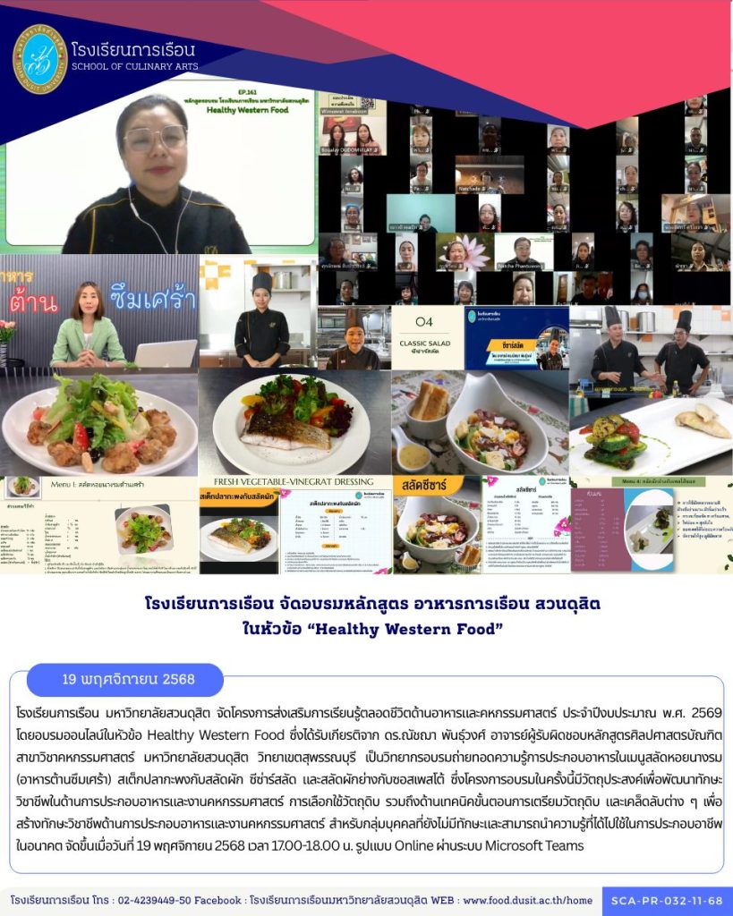 โรงเรียนการเรือน มหาวิทยาลัยสวนดุสิต จัดโครงการส่งเสริมการเรียนรู้ตลอดชีวิตด้านอาหารและคหกรรมศาสตร์ ประจำปีงบประมาณ พ.ศ. 2569 โดยอบรมออนไลน์ในหัวข้อ Healthy Western Food ซึ่งได้รับเกียรติจาก ดร.ณัชฌา พันธุ์วงศ์ อาจารย์ผู้รับผิดชอบหลักสูตรศิลปศาสตรบัณฑิต สาขาวิชาคหกรรมศาสตร์ มหาวิทยาลัยสวนดุสิต วิทยาเขตสุพรรณบุรี เป็นวิทยากรอบรมถ่ายทอดความรู้การประกอบอาหารในเมนูสลัดหอยนางรม (อาหารต้านซึมเศร้า) สเต็กปลากะพงกับสลัดผัก ซีซ่าร์สลัด และสลัดผักย่างกับซอสเพสโต้ ซึ่งโครงการอบรมในครั้งนี้มีวัตถุประสงค์เพื่อพัฒนาทักษะวิชาชีพในด้านการประกอบอาหารและงานคหกรรมศาสตร์ การเลือกใช้วัตถุดิบ รวมถึงด้านเทคนิคขั้นตอนการเตรียมวัตถุดิบ และเคล็ดลับต่าง ๆ เพื่อสร้างทักษะวิชาชีพด้านการประกอบอาหารและงานคหกรรมศาสตร์ สำหรับกลุ่มบุคคลที่ยังไม่มีทักษะและสามารถนำความรู้ที่ได้ไปใช้ในการประกอบอาชีพในอนาคต จัดขึ้นเมื่อวันที่ 19 พฤศจิกายน 2568 เวลา 17.00-18.00 น. รูปแบบ Online ผ่านระบบ Microsoft Teams