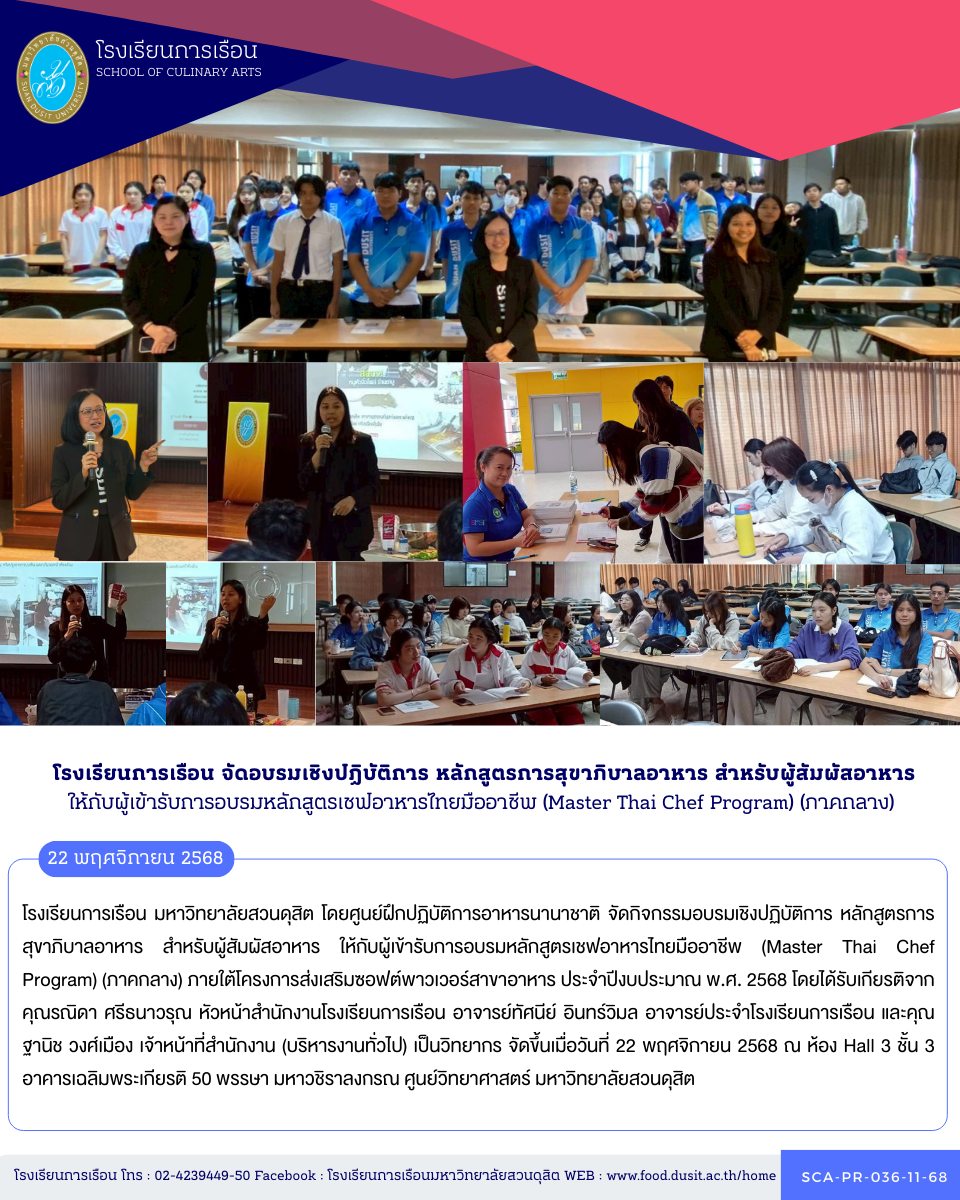 โรงเรียนการเรือน มหาวิทยาลัยสวนดุสิต โดยศูนย์ฝึกปฏิบัติการอาหารนานาชาติ จัดกิจกรรมอบรมเชิงปฏิบัติการ หลักสูตรการสุขาภิบาลอาหาร สำหรับผู้สัมผัสอาหาร ให้กับผู้เข้ารับการอบรมหลักสูตรเชฟอาหารไทยมืออาชีพ (Master Thai Chef Program) (ภาคกลาง) ภายใต้โครงการส่งเสริมซอฟต์พาวเวอร์สาขาอาหาร ประจำปีงบประมาณ พ.ศ. 2568 โดยได้รับเกียรติจาก คุณรณิดา ศรีธนาวรุณ หัวหน้าสำนักงานโรงเรียนการเรือน อาจารย์ทัศนีย์ อินทร์วิมล อาจารย์ประจำโรงเรียนการเรือน และคุณฐานิช วงศ์เมือง เจ้าหน้าที่สำนักงาน (บริหารงานทั่วไป) เป็นวิทยากร จัดขึ้นเมื่อวันที่ 22 พฤศจิกายน 2568 ณ ห้อง Hall 3 ชั้น 3 อาคารเฉลิมพระเกียรติ 50 พรรษา มหาวชิราลงกรณ ศูนย์วิทยาศาสตร์ มหาวิทยาลัยสวนดุสิต