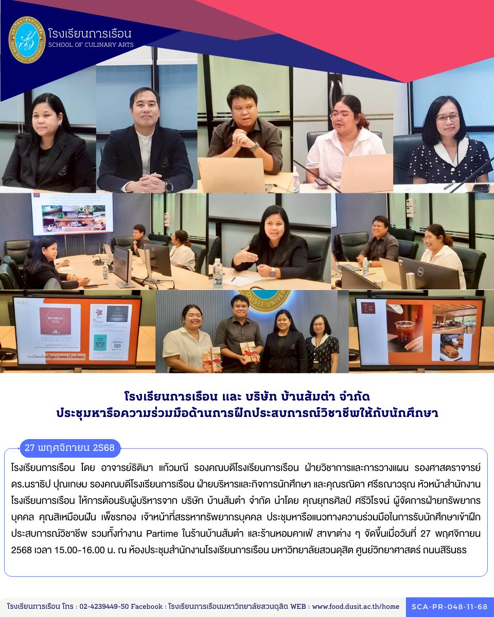 โรงเรียนการเรือน โดย อาจารย์ธิติมา แก้วมณี รองคณบดีโรงเรียนการเรือน ฝ่ายวิชาการและการวางแผน รองศาสตราจารย์ ดร.นราธิป ปุณเกษม รองคณบดีโรงเรียนการเรือน ฝ่ายบริหารและกิจการนักศึกษา และคุณรณิดา ศรีธณาวรุณ หัวหน้าสำนักงานโรงเรียนการเรือน ให้การต้อนรับผู้บริหารจาก บริษัท บ้านส้มตำ จำกัด นำโดย คุณยุทธศิลป์ ศรีวิโรจน์ ผู้จัดการฝ่ายทรัพยากรบุคคล คุณสิเหมือนฝัน เพ็ชรทอง เจ้าหน้าที่สรรหาทรัพยากรบุคคล ประชุมหารือแนวทางความร่วมมือในการรับนักศึกษาเข้าฝึกประสบการณ์วิชาชีพ รวมทั้งทำงาน Partime ในร้านบ้านส้มตำ และร้านหอมคาเฟ่ สาขาต่าง ๆ จัดขึ้นเมื่อวันที่ 27 พฤศจิกายน 2568 เวลา 15.00-16.00 น. ณ ห้องประชุมสำนักงานโรงเรียนการเรือน มหาวิทยาลัยสวนดุสิต ศูนย์วิทยาศาสตร์ ถนนสิรินธร