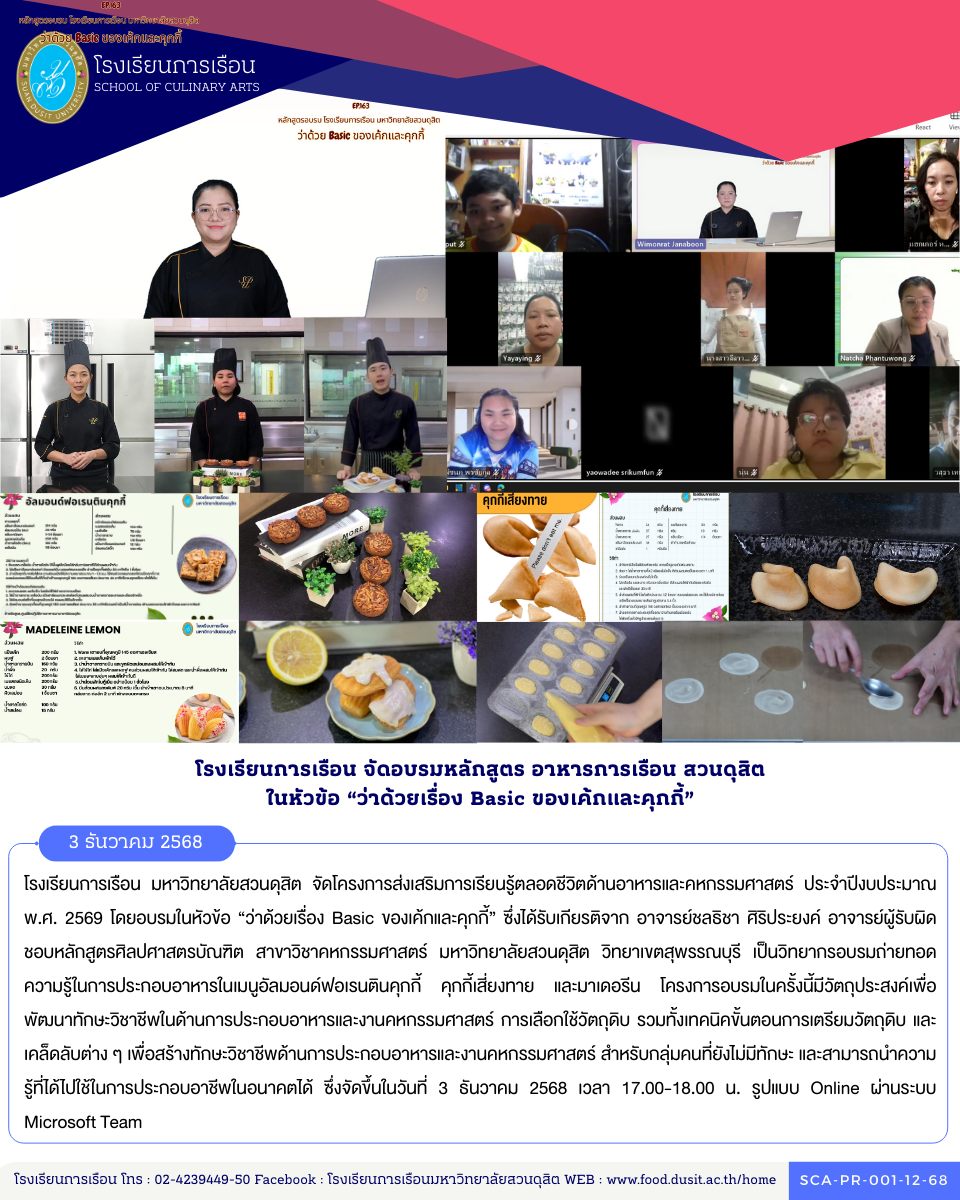 โรงเรียนการเรือน มหาวิทยาลัยสวนดุสิต จัดโครงการส่งเสริมการเรียนรู้ตลอดชีวิตด้านอาหารและคหกรรมศาสตร์ ประจำปีงบประมาณ พ.ศ. 2569 โดยอบรมในหัวข้อ “ว่าด้วยเรื่อง Basic ของเค้กและคุกกี้” ซึ่งได้รับเกียรติจาก อาจารย์ชลธิชา ศิริประยงค์ อาจารย์ผู้รับผิดชอบหลักสูตรศิลปศาสตรบัณฑิต สาขาวิชาคหกรรมศาสตร์ มหาวิทยาลัยสวนดุสิต วิทยาเขตสุพรรณบุรี เป็นวิทยากรอบรมถ่ายทอดความรู้ในการประกอบอาหารในเมนูอัลมอนด์ฟอเรนตินคุกกี้ คุกกี้เสี่ยงทาย และมาเดอรีน โครงการอบรมในครั้งนี้มีวัตถุประสงค์เพื่อพัฒนาทักษะวิชาชีพในด้านการประกอบอาหารและงานคหกรรมศาสตร์ การเลือกใช้วัตถุดิบ รวมทั้งเทคนิคขั้นตอนการเตรียมวัตถุดิบ และเคล็ดลับต่าง ๆ เพื่อสร้างทักษะวิชาชีพด้านการประกอบอาหารและงานคหกรรมศาสตร์ สำหรับกลุ่มคนที่ยังไม่มีทักษะ และสามารถนำความรู้ที่ได้ไปใช้ในการประกอบอาชีพในอนาคตได้ ซึ่งจัดขึ้นในวันที่ 3 ธันวาคม 2568 เวลา 17.00-18.00 น. รูปแบบ Online ผ่านระบบ Microsoft Team