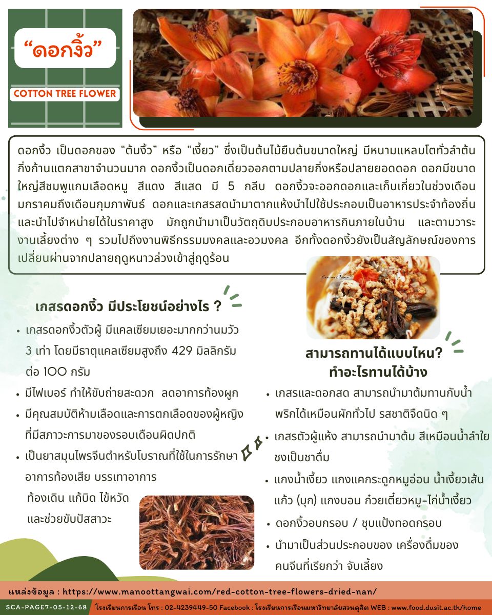 ดอกและเกสรสดนำมาตากแห้งนำไปใช้ประกอบเป็นอาหารประจำท้องถิ่นและนำไปจำหน่ายได้ในราคาสูง มักถูกนำมาเป็นวัตถุดิบประกอบอาหารกินภายในบ้าน และตามวาระงานเลี้ยงต่าง ๆ รวมไปถึงงานพิธีมงคลและอวมงคล ‘ดอกงิ้ว’ คือ ตัวแทนที่สะท้อนให้เห็นถึงวิถีชีวิตและการกินของคนภาคเหนือที่มีมาตั้งแต่โบราณ