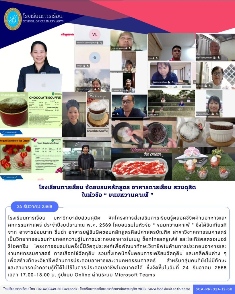 โรงเรียนการเรือน มหาวิทยาลัยสวนดุสิต จัดโครงการส่งเสริมการเรียนรู้ตลอดชีวิตด้านอาหารและคหกรรมศาสตร์ ประจำปีงบประมาณ พ.ศ. 2569 โดยอบรมในหัวข้อ “ ขนมหวานคาเฟ่ ” ซึ่งได้รับเกียรติจาก อาจารย์ชมนาท ชื่นฉ่ำ อาจารย์ผู้รับผิดชอบหลักสูตรศิลปศาสตรบัณฑิต สาขาวิชาคหกรรมศาสตร์ เป็นวิทยากรอบรมถ่ายทอดความรู้ในการประกอบอาหารในเมนู ช็อกโกแลตซูเฟล่ และโยเกิร์ตสตรอเบอร์รี่ไอศกรีม โครงการอบรมในครั้งนี้มีวัตถุประสงค์เพื่อพัฒนาทักษะวิชาชีพในด้านการประกอบอาหารและงานคหกรรมศาสตร์ การเลือกใช้วัตถุดิบ รวมทั้งเทคนิคขั้นตอนการเตรียมวัตถุดิบ และเคล็ดลับต่าง ๆ เพื่อสร้างทักษะวิชาชีพด้านการประกอบอาหารและงานคหกรรมศาสตร์ สำหรับกลุ่มคนที่ยังไม่มีทักษะ และสามารถนำความรู้ที่ได้ไปใช้ในการประกอบอาชีพในอนาคตได้ ซึ่งจัดขึ้นในวันที่ 24 ธันวาคม 2568 เวลา 17.00-18.00 น. รูปแบบ Online ผ่านระบบ Microsoft Teams