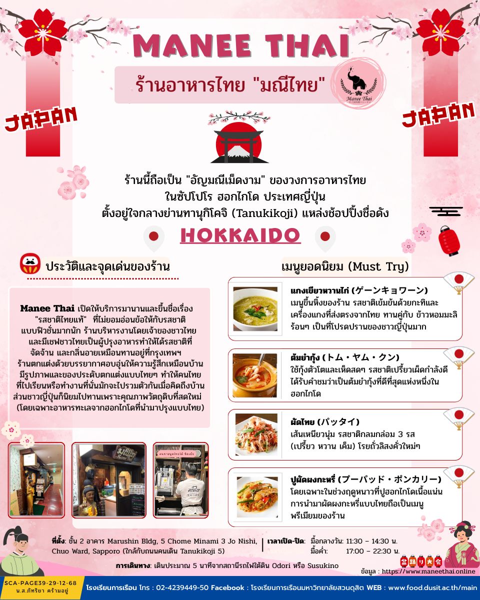 ร้านนี้ถือเป็น “อัญมณีเม็ดงาม” ของวงการอาหารไทย ในซัปโปโร ฮอกไกโด ประเทศญี่ปุน ตั้งอยู่ใจกลางย่านทานุกิโคจิ (Tanukikoji) แหล่งช้อปปิ้งชื่อดังเปิดให้บริการมานานและขึ้นชื่อเรื่อง”รสชาติไทยแท้” ที่มีรสชาติแบบฟิวชั่น ร้านบริหารงานโดยเจ้าของชาวไทย และมีเชฟชาวไทยเป็นผู้ปรุงอาหารทำให้ได้รสชาติที่ จัดจ้าน และกลิ่นอายเหมือนรับประทานอยู่ที่กรุงเทพฯ ร้านตกแต่งด้วยบรรยากาศอบอุ่นให้ความรู้สึกเหมือนบ้าน มีรูปภาพและของประดับตกแต่งแบบไทยๆ ทำให้คนไทยที่ไปเรียนหรือทำงานที่นั่น มักจะไปรวมตัวกันเมื่อคิดถึงบ้าน ส่วนชาวญี่ปุ่นก็นิยมไปทานเพราะคุณภาพวัตถุดิบที่สดใหม่ (โดยเฉพาะอาหารทะเลจากฮอกไกโดที่นำมาปรุงแบบไทย)