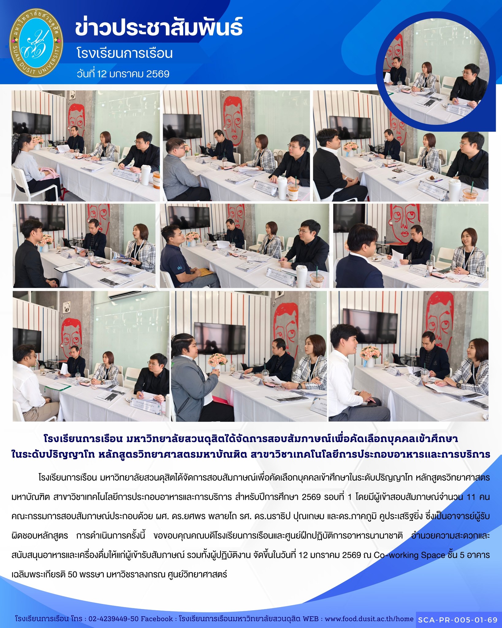 โรงเรียนการเรือน มหาวิทยาลัยสวนดุสิตได้จัดการสอบสัมภาษณ์เพื่อคัดเลือกบุคคลเข้าศึกษาในระดับปริญญาโท หลักสูตรวิทยาศาสตรมหาบัณฑิต สาขาวิชาเทคโนโลยีการประกอบอาหารและการบริการ สำหรับปีการศึกษา 2569 รอบที่ 1 โดยมีผู้เข้าสอบสัมภาษณ์จำนวน 11 คน คณะกรรมการสอบสัมภาษณ์ประกอบด้วย ผศ. ดร.ยศพร พลายโถ รศ. ดร.นราธิป ปุณเกษม และดร.ภาคภูมิ คูประเสริฐยิ่ง ซึ่งเป็นอาจารย์ผู้รับผิดชอบหลักสูตร การดำเนินการครั้งนี้ ขอขอบคุณคณบดีโรงเรียนการเรือนและศูนย์ฝึกปฏิบัติการอาหารนานาชาติ อำนวยความสะดวกและสนับสนุนอาหารและเครื่องดื่มให้แก่ผู้เข้ารับสัมภาษณ์ รวมทั้งผู้ปฏิบัติงาน จัดขึ้นในวันที่ 12 มกราคม 2569 ณ Co-working Space ชั้น 5 อาคารเฉลิมพระเกียรติ 50 พรรษา มหาวิชราลงกรณ ศูนย์วิทยาศาสตร์