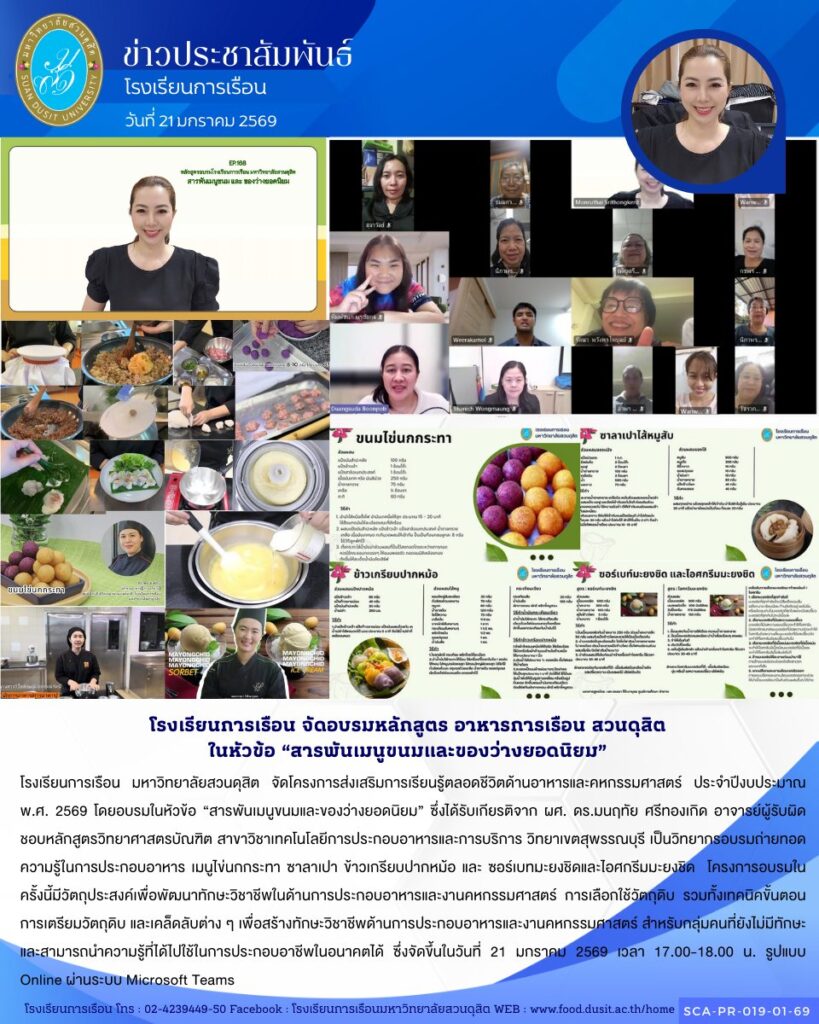 โรงเรียนการเรือน มหาวิทยาลัยสวนดุสิต จัดโครงการส่งเสริมการเรียนรู้ตลอดชีวิตด้านอาหารและคหกรรมศาสตร์ ประจำปีงบประมาณ พ.ศ. 2569 โดยอบรมในหัวข้อ “สารพันเมนูขนมและของว่างยอดนิยม” ซึ่งได้รับเกียรติจาก ผศ. ดร.มนฤทัย ศรีทองเกิด อาจารย์ผู้รับผิดชอบหลักสูตรวิทยาศาสตรบัณฑิต สาขาวิชาเทคโนโลยีการประกอบอาหารและการบริการ วิทยาเขตสุพรรณบุรี เป็นวิทยากรอบรมถ่ายทอดความรู้ในการประกอบอาหาร เมนูไข่นกกระทา ซาลาเปา ข้าวเกรียบปากหม้อ และ ซอร์เบทมะยงชิดและไอศกรีมมะยงชิด โครงการอบรมในครั้งนี้มีวัตถุประสงค์เพื่อพัฒนาทักษะวิชาชีพในด้านการประกอบอาหารและงานคหกรรมศาสตร์ การเลือกใช้วัตถุดิบ รวมทั้งเทคนิคขั้นตอนการเตรียมวัตถุดิบ และเคล็ดลับต่าง ๆ เพื่อสร้างทักษะวิชาชีพด้านการประกอบอาหารและงานคหกรรมศาสตร์ สำหรับกลุ่มคนที่ยังไม่มีทักษะ และสามารถนำความรู้ที่ได้ไปใช้ในการประกอบอาชีพในอนาคตได้ ซึ่งจัดขึ้นในวันที่ 21 มกราคม 2569 เวลา 17.00-18.00 น. รูปแบบ Online ผ่านระบบ Microsoft Teams