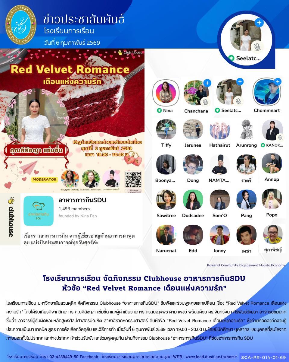 โรงเรียนการเรือน มหาวิทยาลัยสวนดุสิต จัดกิจกรรม Clubhouse “อาหารการกินSDU” รับฟังและร่วมพูดคุยแลกเปลี่ยน เรื่อง “Red Velvet Romance เดือนแห่งความรัก” โดยได้รับเกียรติจากวิทยากร คุณศีลัชญา แช่มชื่น และผู้ดำเนินรายการ ดร.เบญจพร ดามาพงษ์ พร้อมด้วย ดร.จันทร์จนา ศิริพันธ์วัฒนา อาจารย์ชมนาท ชื่นฉ่ำ อาจารย์ผู้รับผิดชอบหลักสูตรศิลปศาสตรบัณฑิต สาขาวิชาคหกรรมศาสตร์ กับหัวข้อ “Red Velvet Romance เดือนแห่งความรัก” ซึ่งถ่ายทอดองค์ความรู้ ประความเป็นมา เทคนิค สูตร การคัดเลือกวัตถุดิบ และวิธีการทำ เมื่อวันที่ 6 กุมภาพันธ์ 2569 เวลา 19.00 – 20.00 น. โดยมีนักศึกษา บุคลากร และบุคคลที่สนใจจากภายนอกทั้งในประเทศและต่างประเทศ เข้าร่วมรับฟังและร่วมพูดคุยกัน ผ่านกิจกรรม Clubhouse “อาหารการกินSDU” ที่ช่องอาหารการกิน SDU