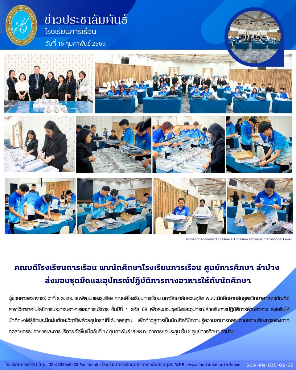 ผู้ช่วยศาสตราจารย์ ว่าที่ ร.ต. ดร. ธนพัฒน์ แสงรุ่งเรือง คณบดีโรงเรียนการเรือน มหาวิทยาลัยสวนดุสิต พบปะนักศึกษาหลักสูตรวิทยาศาสตรบัณฑิต สาขาวิชาเทคโนโลยีการประกอบอาหารและการบริการ ชั้นปีที่ 1 รหัส 68 เพื่อส่งมอบชุดมีดและอุปกรณ์สำหรับการปฏิบัติการด้านอาหาร ส่งเสริมให้นักศึกษาได้รู้จักและฝึกฝนทักษะวิชาชีพด้วยอุปกรณ์ที่ได้มาตรฐาน เพื่อก้าวสู่การเป็นบัณฑิตที่มีความรู้ความสามารถตรงตามความต้องการของภาคอุตสาหกรรมอาหารและการบริการ จัดขึ้นเมื่อวันที่ 17 กุมภาพันธ์ 2568 ณ อาคารหอประชุม ชั้น 2 ศูนย์การศึกษา ลำปาง