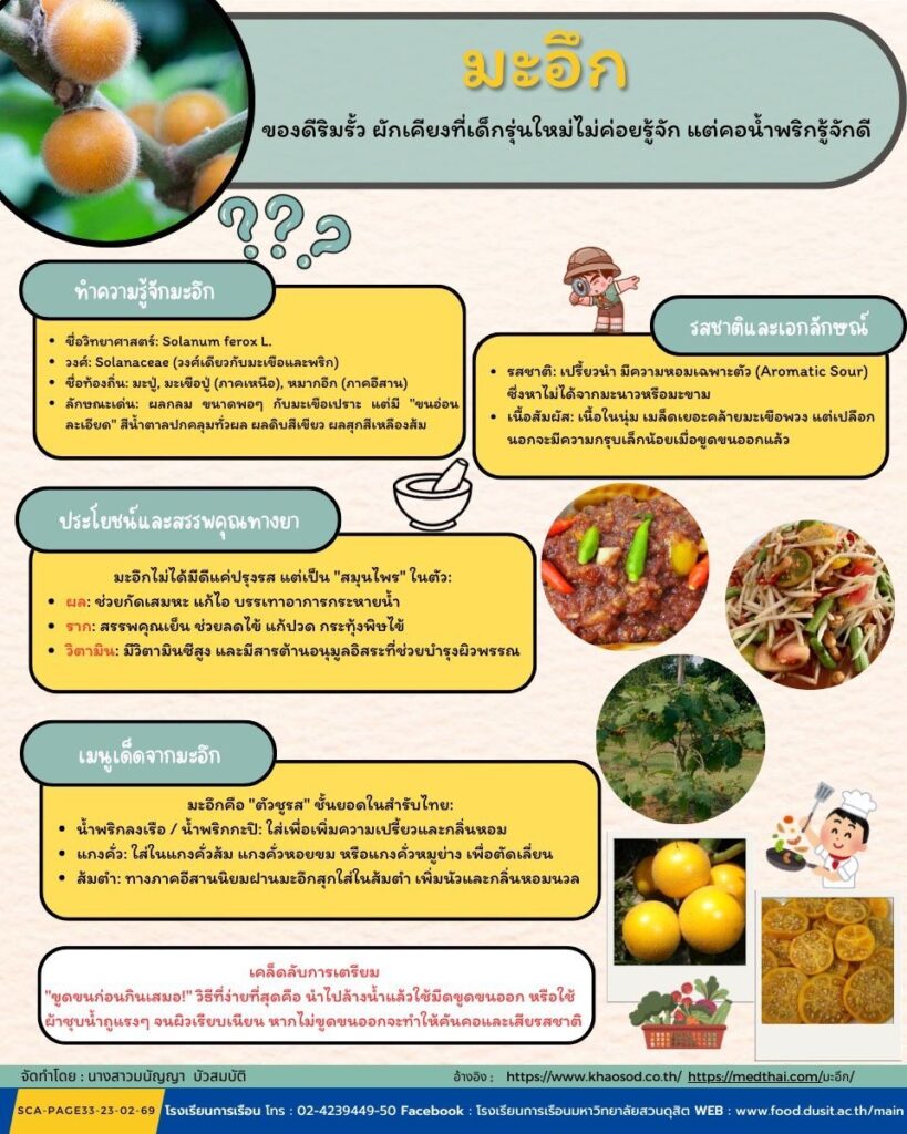 จากสวนหลังบ้านสู่ตำรับน้ำพริกชาววัง ‘มะอึก’ คือ ตัวแทนความละเมียดละไมของครัวไทยที่กำลังถูกลืม ไม่ใช่แค่ช่วยชูรสแกงคั่วให้นัวและดับคาวน้ำพริกได้อย่างยอดเยี่ยม แต่ยังเป็นสมุนไพรชั้นดีที่ช่วยกัดเสมหะและแก้ไอได้อย่างชะงัด ถึงเวลาแล้วที่เราจะพาเจ้าผลไม้มีขนตัวนี้กลับมาโลดแล่นในจานอาหารของคุณอีกครั้ง