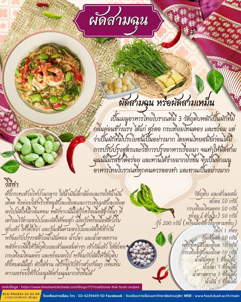 เมนูผัดสามฉุน หรือผัดสามเหม็น เป็นเมนูอาหารไทยโบราณที่มี 3 วัตถุดิบหลักเป็นผักที่มีกลิ่นค่อนข้างแรง ได้แก่ สะตอ กระเทียมโทนดอง และชะอม แต่ว่าเป็นผักที่มีประโยชน์เป็นอย่างมาก โดยคนไทยสมัยก่อนได้มีการปรับปรุงสูตรและวิธีการปรุงอาหารเรื่อยมา จนทำให้ผัดสามฉุนนั้นมีรสชาติอร่อย และทานได้ง่ายมากยิ่งขึ้น จึงเป็นอีกเมนูอาหารไทยโบราณที่ทุกคนควรลองทำและทานเป็นอย่างมาก