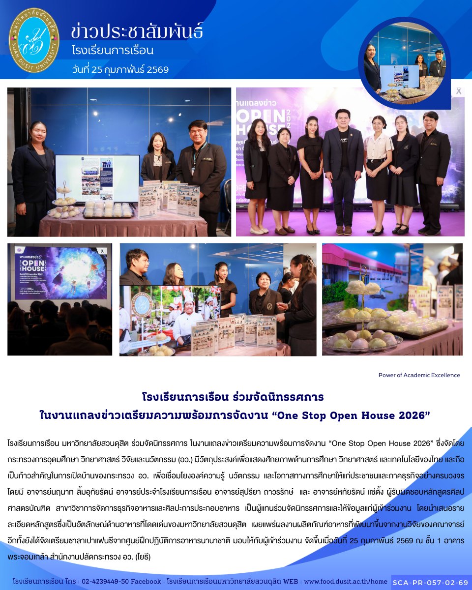 โรงเรียนการเรือน มหาวิทยาลัยสวนดุสิต ร่วมจัดนิทรรศการ ในงานแถลงข่าวเตรียมความพร้อมการจัดงาน “One Stop Open House 2026” ซึ่งจัดโดยกระทรวงการอุดมศึกษา วิทยาศาสตร์ วิจัยและนวัตกรรม (อว.) มีวัตถุประสงค์เพื่อแสดงศักยภาพด้านการศึกษา วิทยาศาสตร์ และเทคโนโลยีของไทย และถือเป็นก้าวสำคัญในการเปิดบ้านของกระทรวง อว. เพื่อเชื่อมโยงองค์ความรู้ นวัตกรรม และโอกาสทางการศึกษาให้แก่ประชาชนและภาคธุรกิจอย่างครบวงจร โดยมี อาจารย์นฤนาท ลิ้มอุทัยรัตน์ อาจารย์ประจำโรงเรียนการเรือน อาจารย์สุปรียา ถาวรรักษ์ และ อาจารย์หทัยรัตน์ แซ่ตั้ง ผู้รับผิดชอบหลักสูตรศิลปศาสตรบัณฑิต สาขาวิชาการจัดการธุรกิจอาหารและศิลปะการประกอบอาหาร เป็นผู้แทนร่วมจัดนิทรรศการและให้ข้อมูลแก่ผู้เข้าร่วมงาน โดยนำเสนอรายละเอียดหลักสูตรซึ่งเป็นอัตลักษณ์ด้านอาหารที่โดดเด่นของมหาวิทยาลัยสวนดุสิต เผยแพร่ผลงานผลิตภัณฑ์อาหารที่พัฒนาขึ้นจากงานวิจัยของคณาจารย์ อีกทั้งยังได้จัดเตรียมซาลาเปาแฟนซีจากศูนย์ฝึกปฏิบัติการอาหารนานาชาติ มอบให้กับผู้เข้าร่วมงาน จัดขึ้นเมื่อวันที่ 25 กุมภาพันธ์ 2569 ณ ชั้น 1 อาคารพระจอมเกล้า สำนักงานปลัดกระทรวง อว. (โยธี)